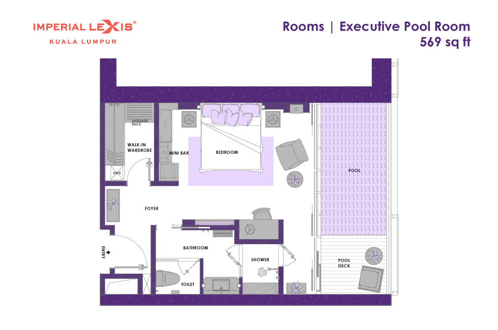 Представительский номер с 1-ой двуспальной кроватью, ванная комната с душевой кабиной, гардеробная, гостевая зона, балкон с частным бассейном (без подогрева), вид на город, вид на башни-близнецы, план номера вар.1, план номера вар.2, план номера вар.3, план номера вар.4;