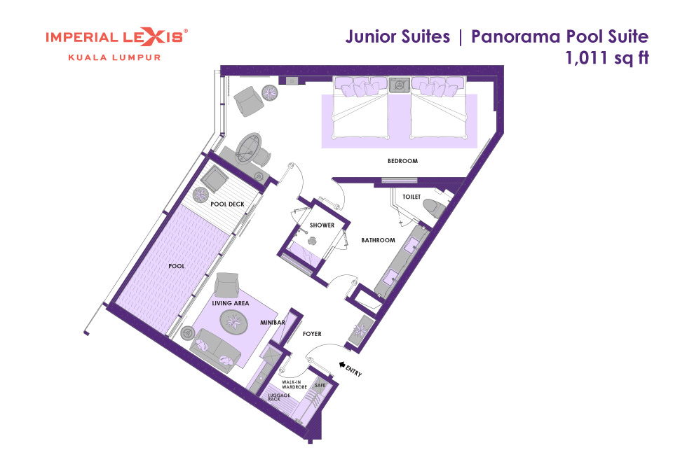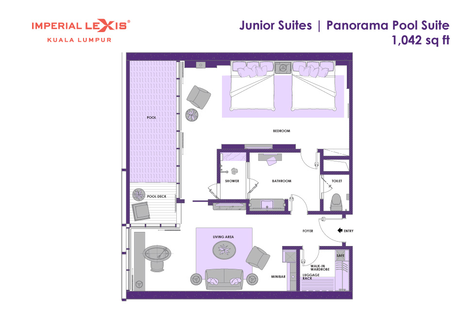 Двухкомнатный панорамный сьют: спальня с 2-мя двуспальными кроватями, ванная комната с душевой кабиной, гардеробная, отдельная гостиная, балкон с частным бассейном (без подогрева), панорамный вид на город, план номера вар.1, план номера вар.2, план номера вар.3;