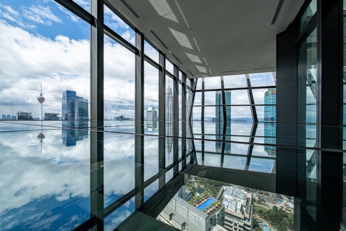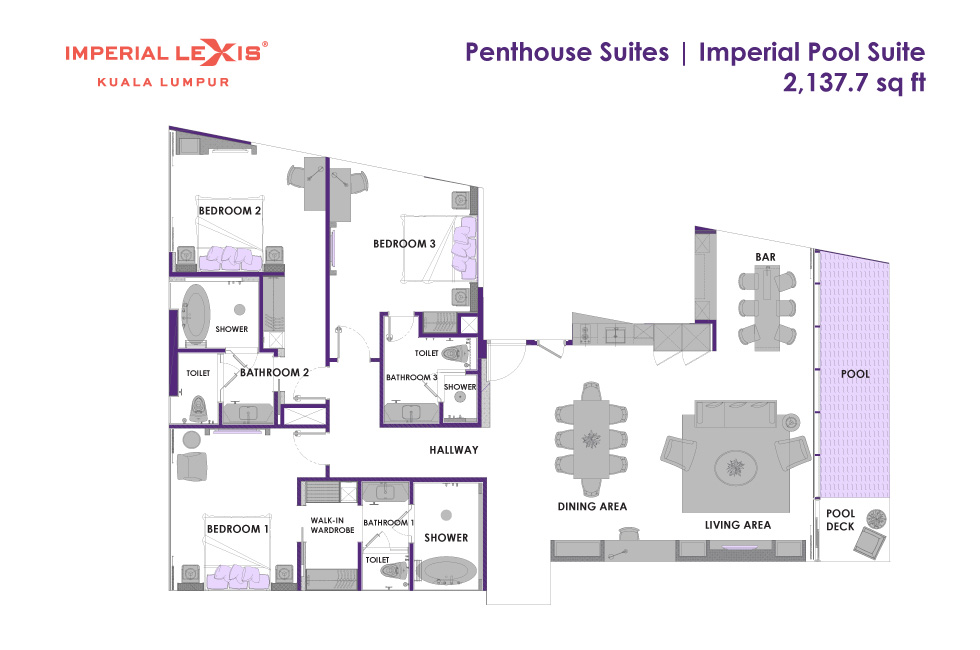 Императорский сьют на 50 этаже: 3 спальни с двуспальной кроватью в каждой, 2 ванные комнаты с ванной и душевой кабиной, 1 ванная комната с душевой кабиной, гардеробная, отдельная гостиная открытой планировки с кухней и столовой (обеденный стол на 6 персон), балкон с просторным частным бассейном (без подогрева), панорамный вид на город; привилегии для проживающих*, план номера;
