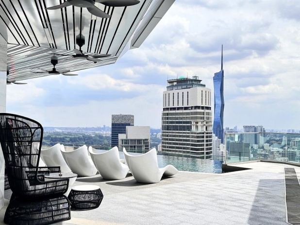 Королевский сьют на 50 этаже: 2 спальни с одной двуспальной и двумя двуспальными кроватями, 2 ванные комнаты с ванной и душевой кабиной, гардеробная, отдельная гостиная открытой планировки с кухней и столовой (обеденный стол на 6 персон), балкон с просторным частным бассейном (без подогрева), панорамный вид на город; привилегии для проживающих*, план номера;