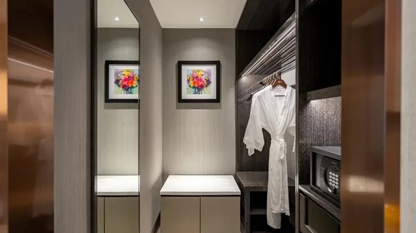 Сьют–апартаменты с 3-мя спальнями расположены на 36–45 этажах: каждая с двуспальной кроватью, 2 спальни с собственной ванной комнатой: одна с душем и ванной, вторая – с душевой кабиной, гардеробная, отдельная гостиная, обеденная зона со столом на 6 персон и мини-кухня: холодильник, СВЧ-печь, плита, раковина, шкафы для хранения, стиральная и сушильная машины, вид на город; план номера;