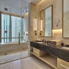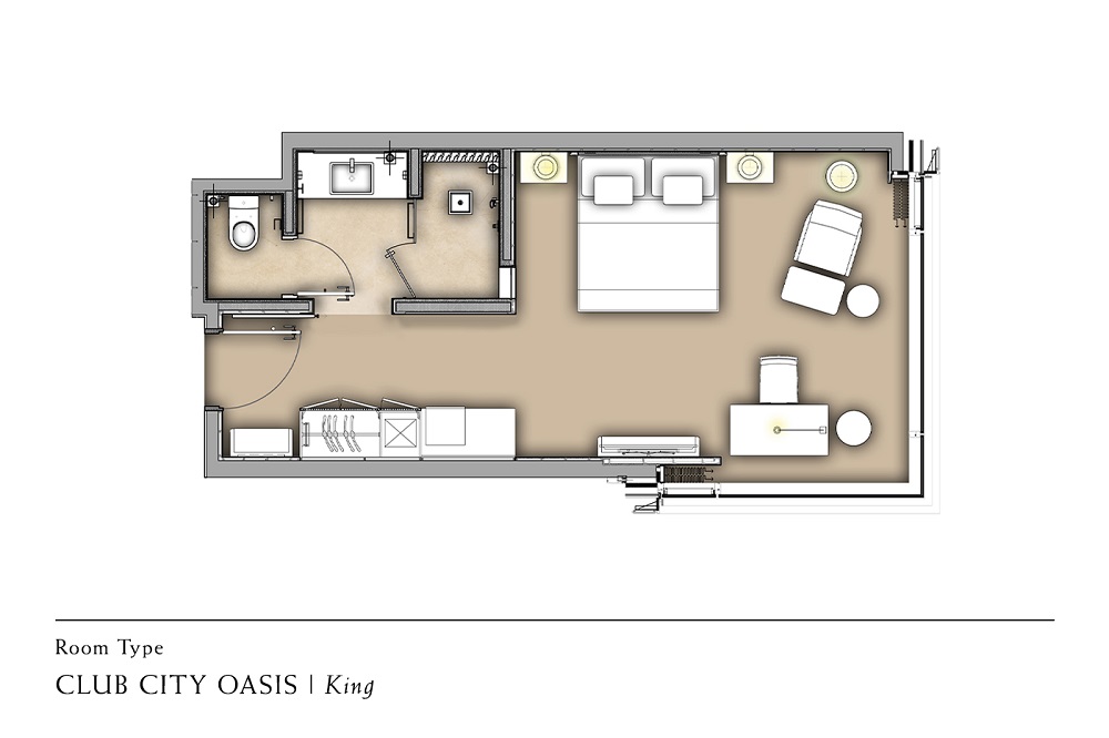 Угловая студия с панорамными окнами от пола до потолка, есть варианты с двуспальной кроватью king-size или 2-мя односпальными кроватями, гостиная зона (круглый диван в студии с 2-мя односпальными кроватями), письменный стол; ванная комната с тропическим душем, ванной у окна (круглая ванна в студии с кроватью king-size ) и отдельным туалетом; вид на город; клубные привилегии*; план номера king-size; план номера twin;