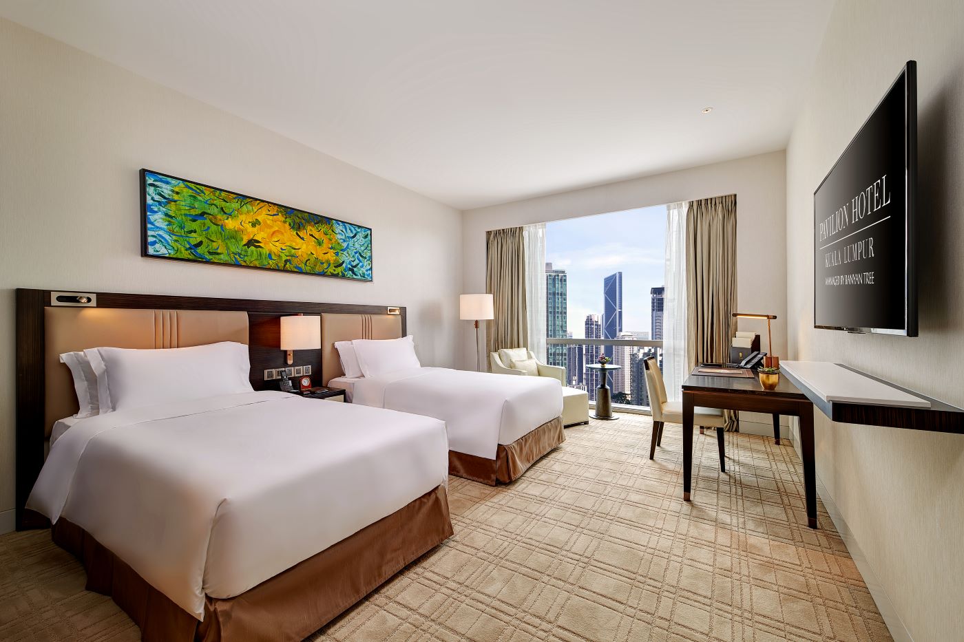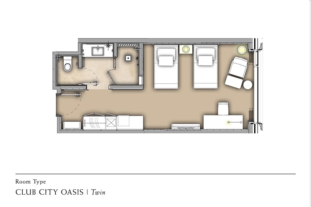 Клубный* семейный номер объединяющий 2 смежных номера City Oasis Room: с двуспальной кроватью king-size и 2-мя односпальными кроватями, в каждой спальне журнальный столик, кресло, письменный стол, собственная ванная комната с тропическим душем и отдельным туалетом; вид на город/ во внутренний двор; план номера king-size; план номера twin;