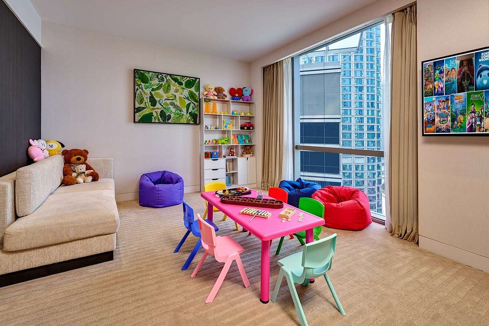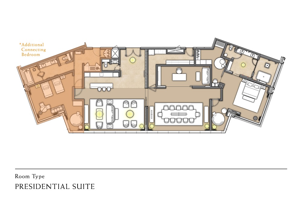 Президентский люкс с высокими окнами от пола до потолка, отдельная спальня с двуспальной кроватью king-size и зоной отдыха с круглым диваном; ванная комната с тропическим душем и большой ванной у окна, отделенной стеклянной дверью; столовая с обеденным столом на 12 персон отделяется раздвижной дверью от кабинета с рабочим столом и диваном; отдельная гостиная с зоной отдыха, барной стойкой и оборудованной зоной мини-кухни с раковиной и кухонными шкафами; можно присоединить смежный номер Urban Studio с 2-мя односпальными кроватями; вид на город; клубные привилегии*; круглосуточная служба Resort Host Service; люкс идеален для семьи, компании друзей или небольшой делегации; план номера;