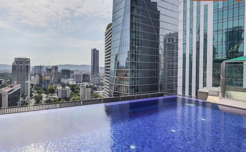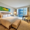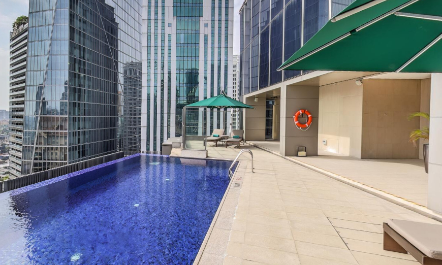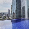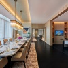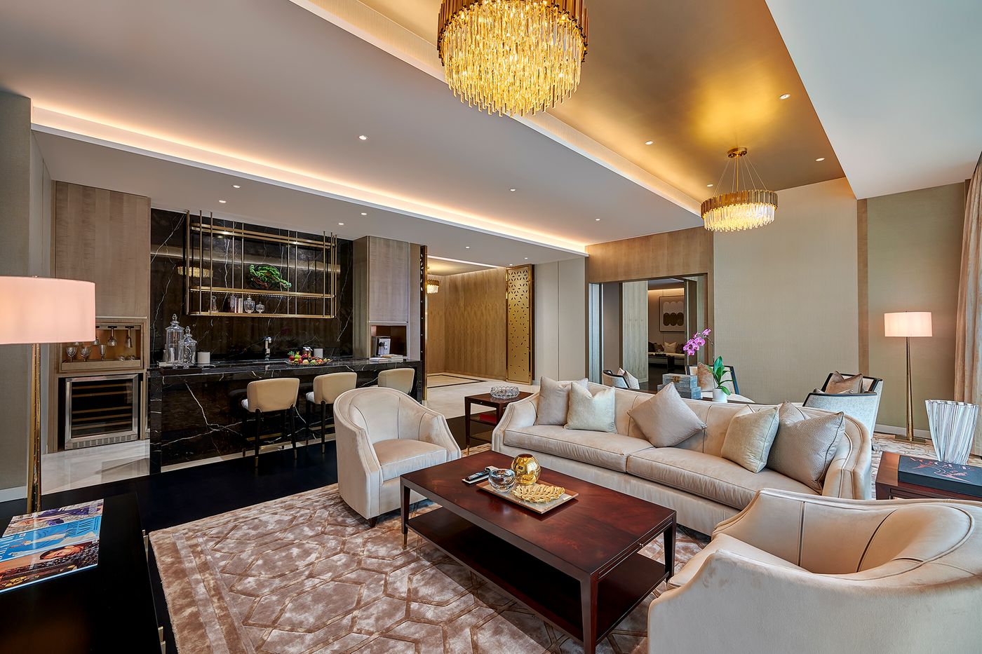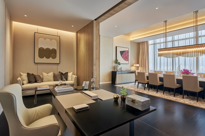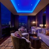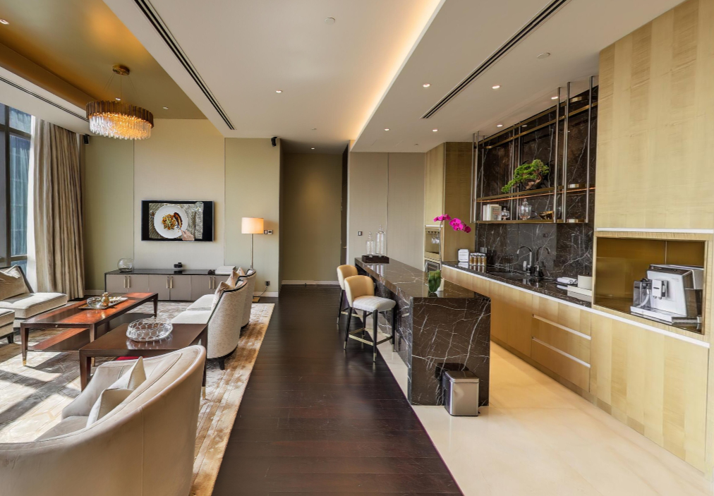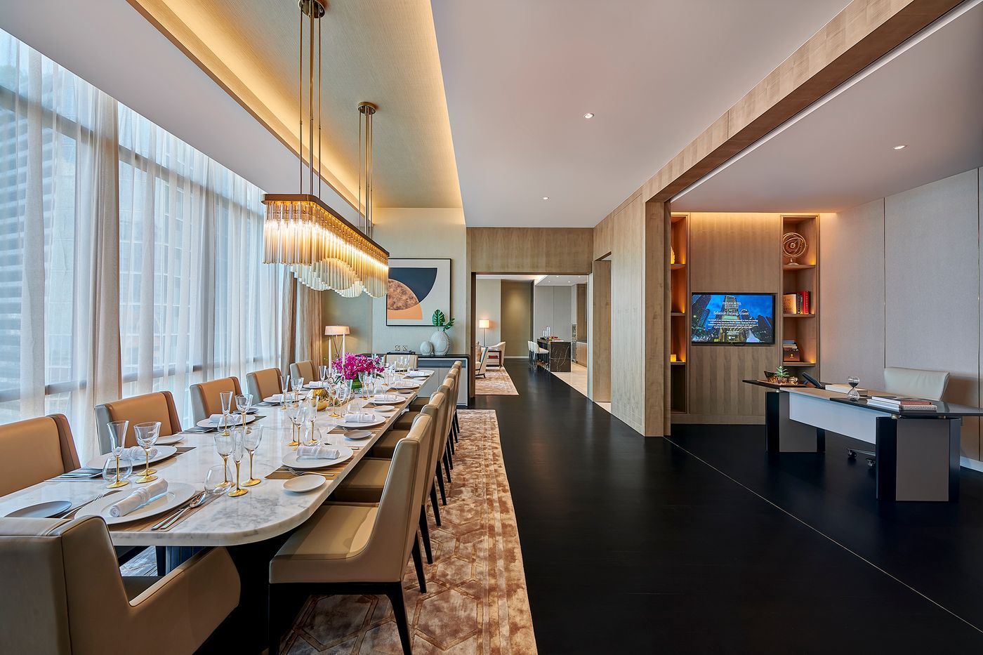 Люкс с высокими окнами от пола до потолка, отдельная спальня с двуспальной кроватью king-size, кушеткой, гардеробной и отдельной ванной комнатой с тропическим душем, ванной и отдельным туалетом; отдельная гостиная с зоной отдыха и рабочим столом; отдельная столовая со столом на 8 персон, барной стойкой со стульями, кухонными шкафами с посудой и раковиной; есть дополнительная гостевая туалетная комната; можно присоединить смежный номер с двумя односпальными кроватями; вид на город; клубные привилегии*; план номера;