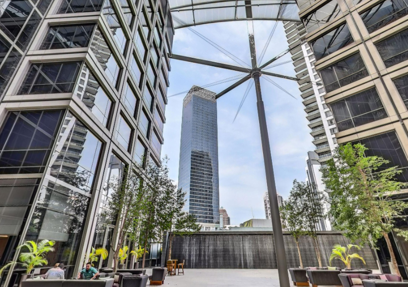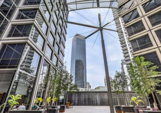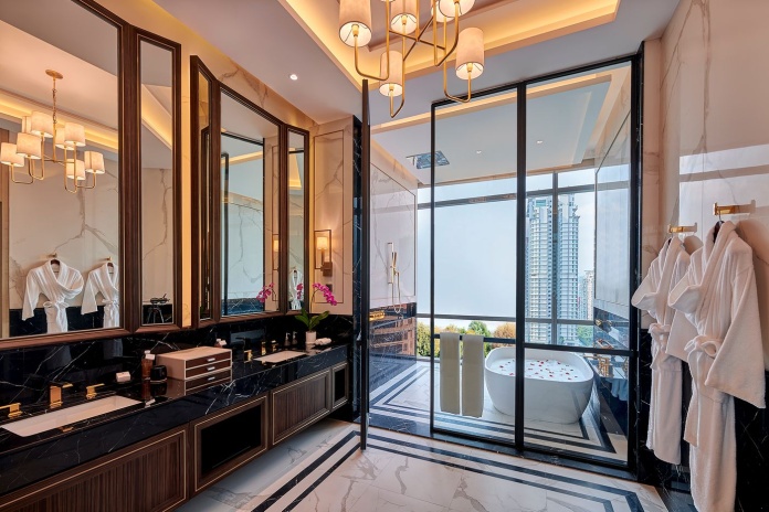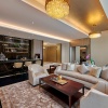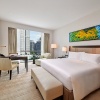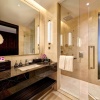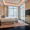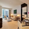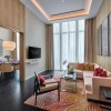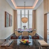 Угловой люкс с панорамными окнами от пола до потолка, отдельная спальня с двуспальной кроватью king-size, креслом и рабочим столом, отдельная гостиная с обеденной зоной на 4 персоны и зоной отдыха с диваном и журнальным столом, мраморная ванная комната с тропическим душем, ванной и отдельным туалетом, вид на город/ во внутренний двор; клубные привилегии*; план номера;