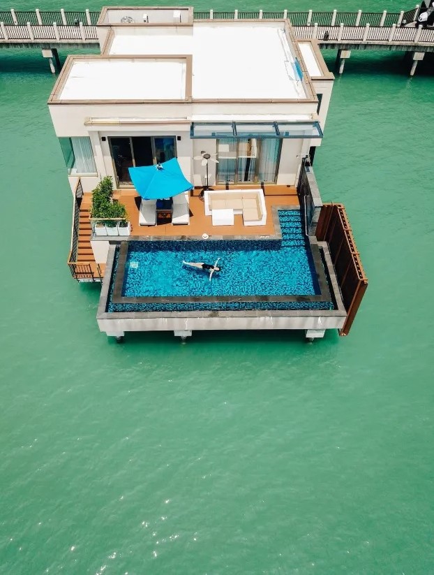 Вилла на сваях над водой (доступ по пирсу): спальня с 1-й двуспальной кроватью, ванная комната с ванной и душевой кабиной, гардеробная, отдельная гостиная с обеденной зоной, мини-кухня с кухонными принадлежностями, просторная меблированная терраса-патио, небольшой частный бассейн, вид на море и на закат;