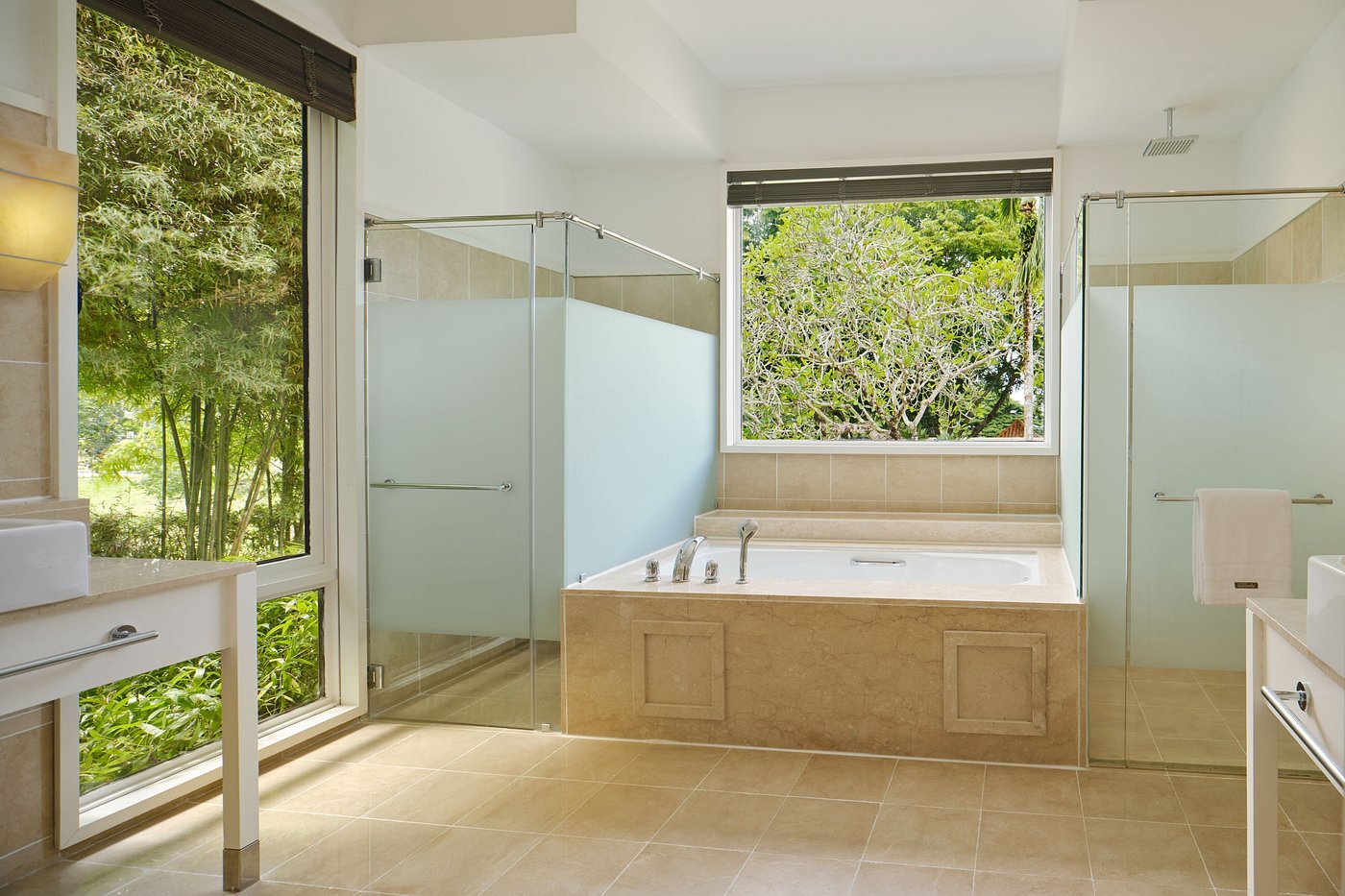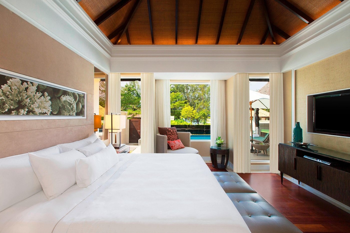Вилла с 2-мя спальнями: с одной двуспальной и 2-мя односпальными кроватями, 2 ванные комнаты с ванной и душевой кабиной, отдельная гостиная, обеденная зона и мини-кухня (СВЧ-печь, кофеварка, чайник), меблированная терраса (зонты, шезлонги), беседка, душ на открытом воздухе, частный бассейн, вид на территорию отеля/ на сад (отличаются расположением на территории отеля: на 1-й линии от пляжа, на 2 линии от пляжа и уединенная вилла недалеко от основного входа);