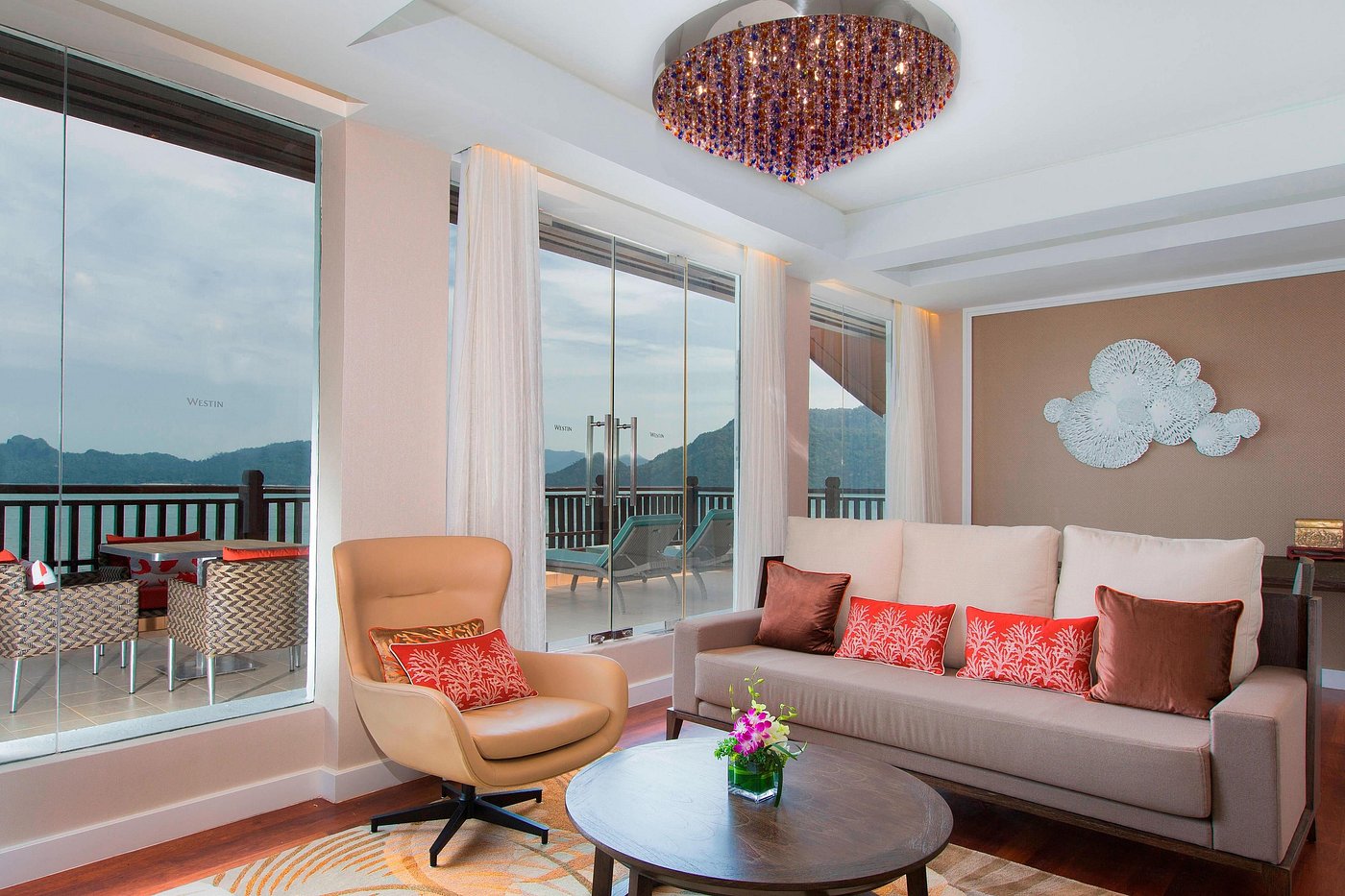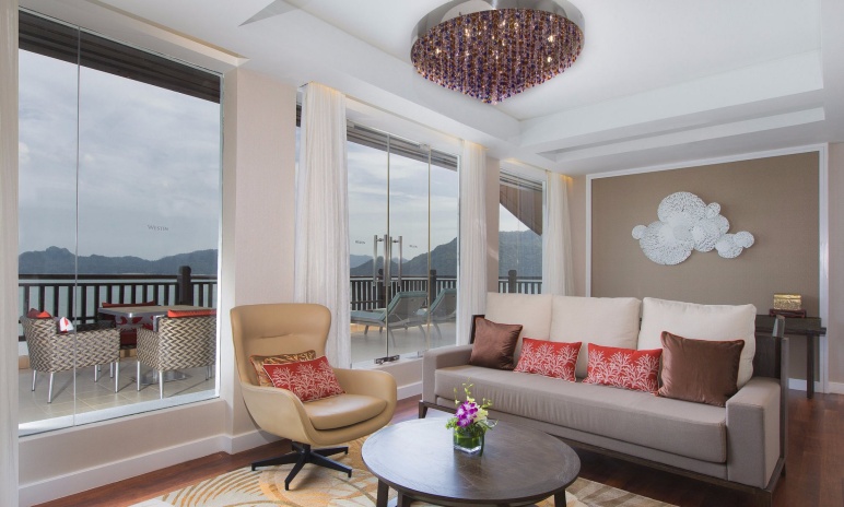 Сьют c 1-й спальней с двуспальной кроватью, раздвижные стеклянные двери в ванную комнату с ванной и душевой кабиной, отдельная гостиная с обеденной зоной, меблированный балкон, частичный вид на море;