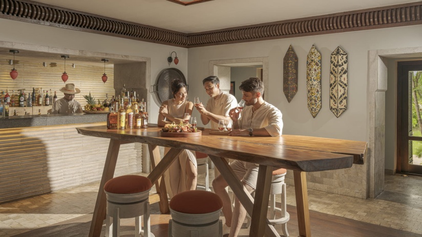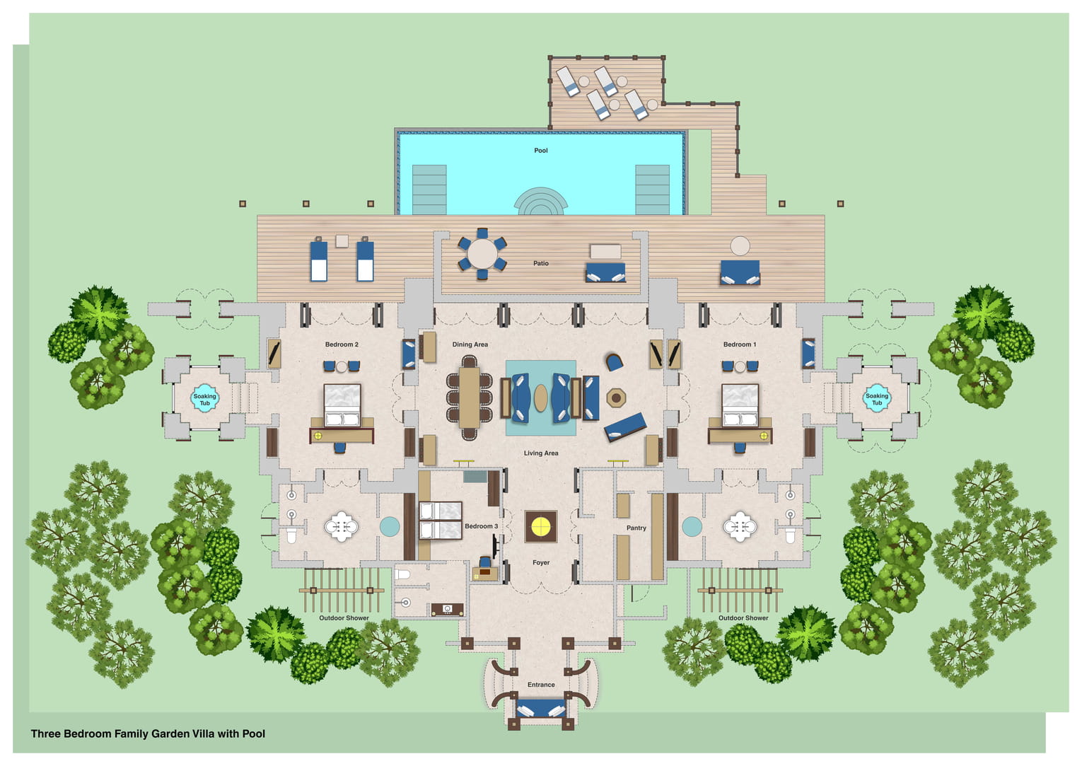Вилла c 3-мя спальнями в южной части курорта: 2 спальни с двуспальными кроватями, каждая с собственной ванной комнатой с ванной и душевой кабиной, ванной-джакузи и душем на открытом воздухе; 1 спальня с двумя односпальными кроватями и собственной ванной комнатой с душевой кабиной, просторная гостиная с зоной отдыха и обеденной зоной на 8 персон, гардеробная/ кладовая, выход на меблированную террасу-патио с обеденным столом и зонами отдыха с кушетками и шезлонгами, частный бассейн (22 м²), сад, вид на сад; привилегии для гостей*, план номера;
