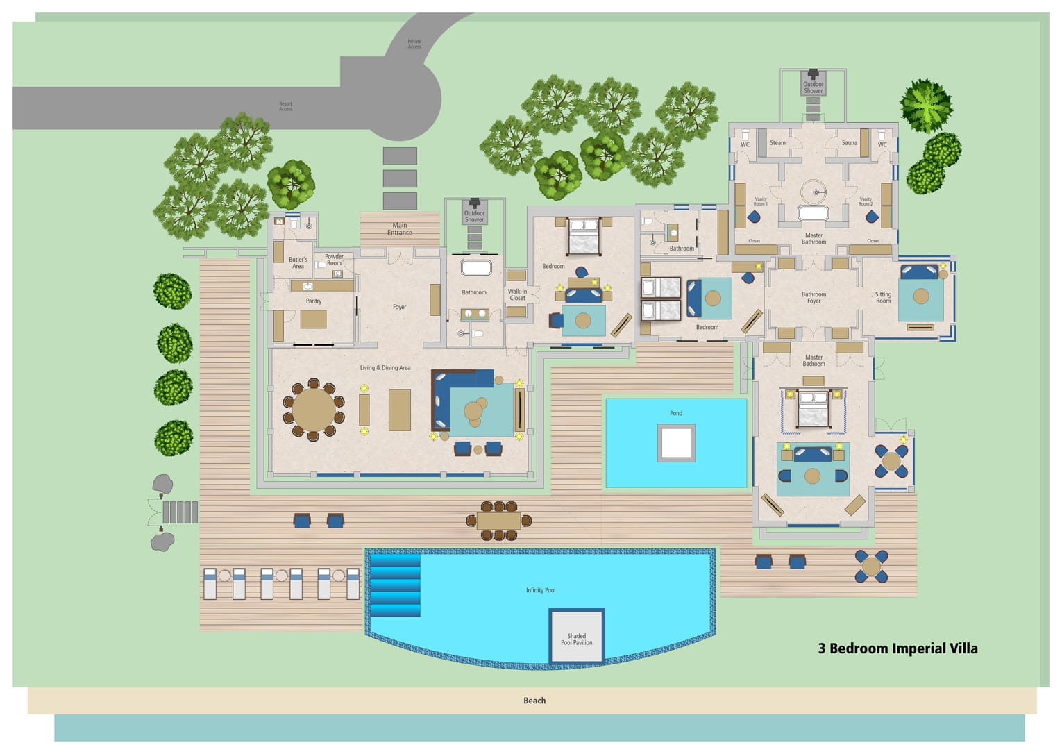 Императорская вилла c 3-мя спальнями: 2 спальни с двуспальными кроватями, одна – с 2-мя односпальными; в двух ванных комнатах – ванна, душевая кабина и душ на открытом воздухе (в просторной ванной комнате главной спальне – гардеробная, сауна и хамам), в одной ванной комнате – душевая кабина: во всех спальнях есть гостиная зона, в главной спальне – гостиная и обеденная зона на 4 персоны; общая просторная гостиная с обеденной зоной на 8 персон, кухня, помещение для консьержа, подсобные помещения, выход на меблированную террасу-патио с обеденным столом на 8 персон, зонами отдыха с кушетками, шезлонгами, беседками, частный бассейн, сад, пляжный гамак, выход на пляж, частная подъездная дорожка, вид на море; привилегии для гостей*, план номера;