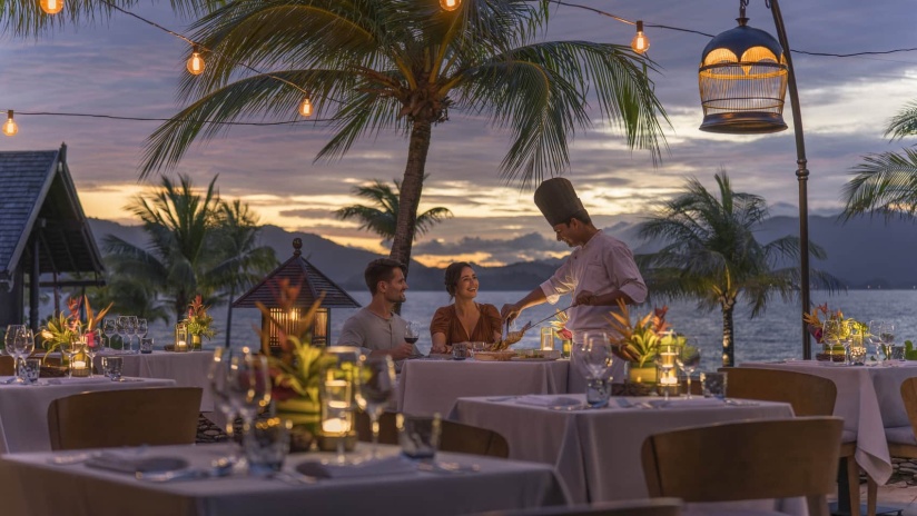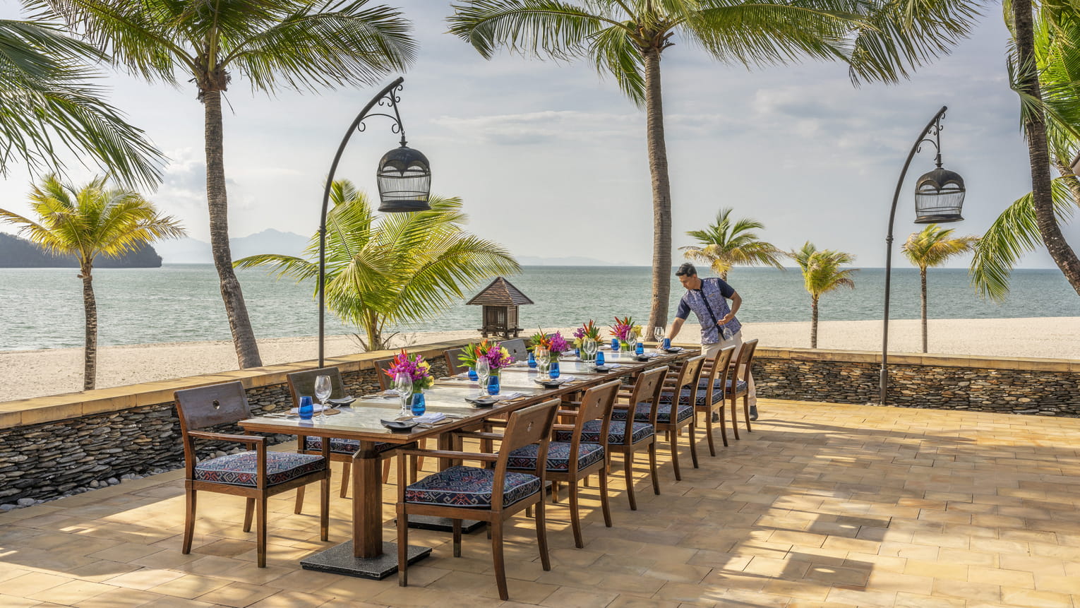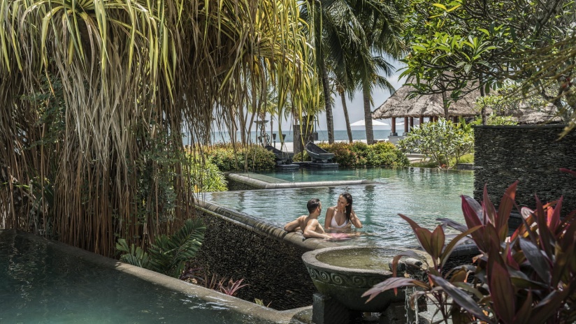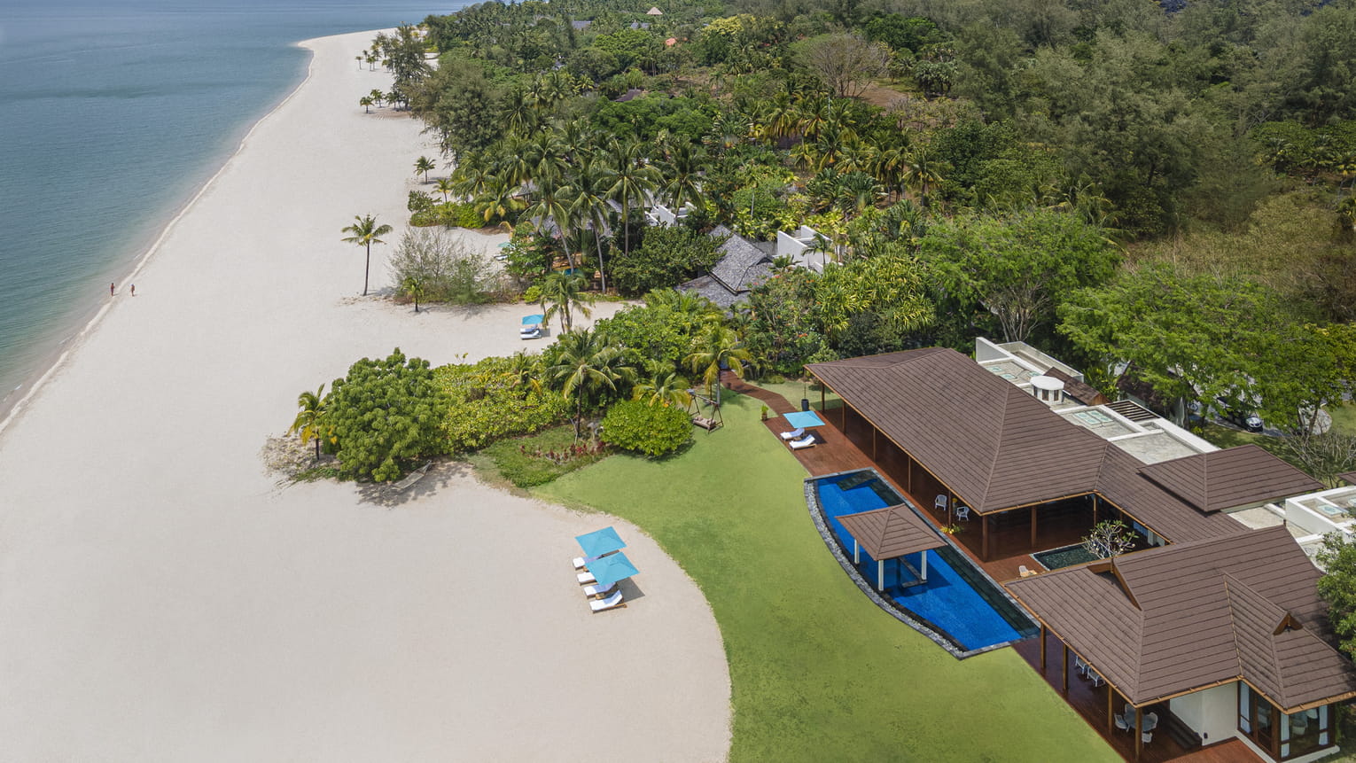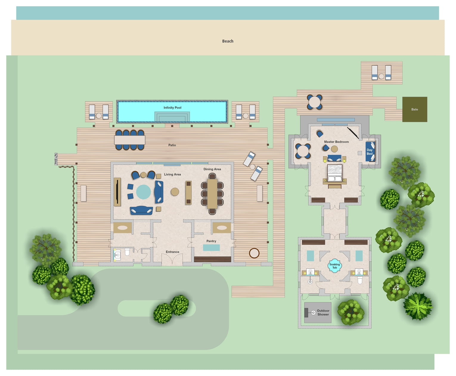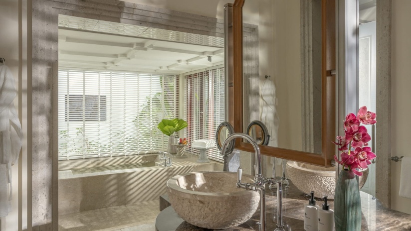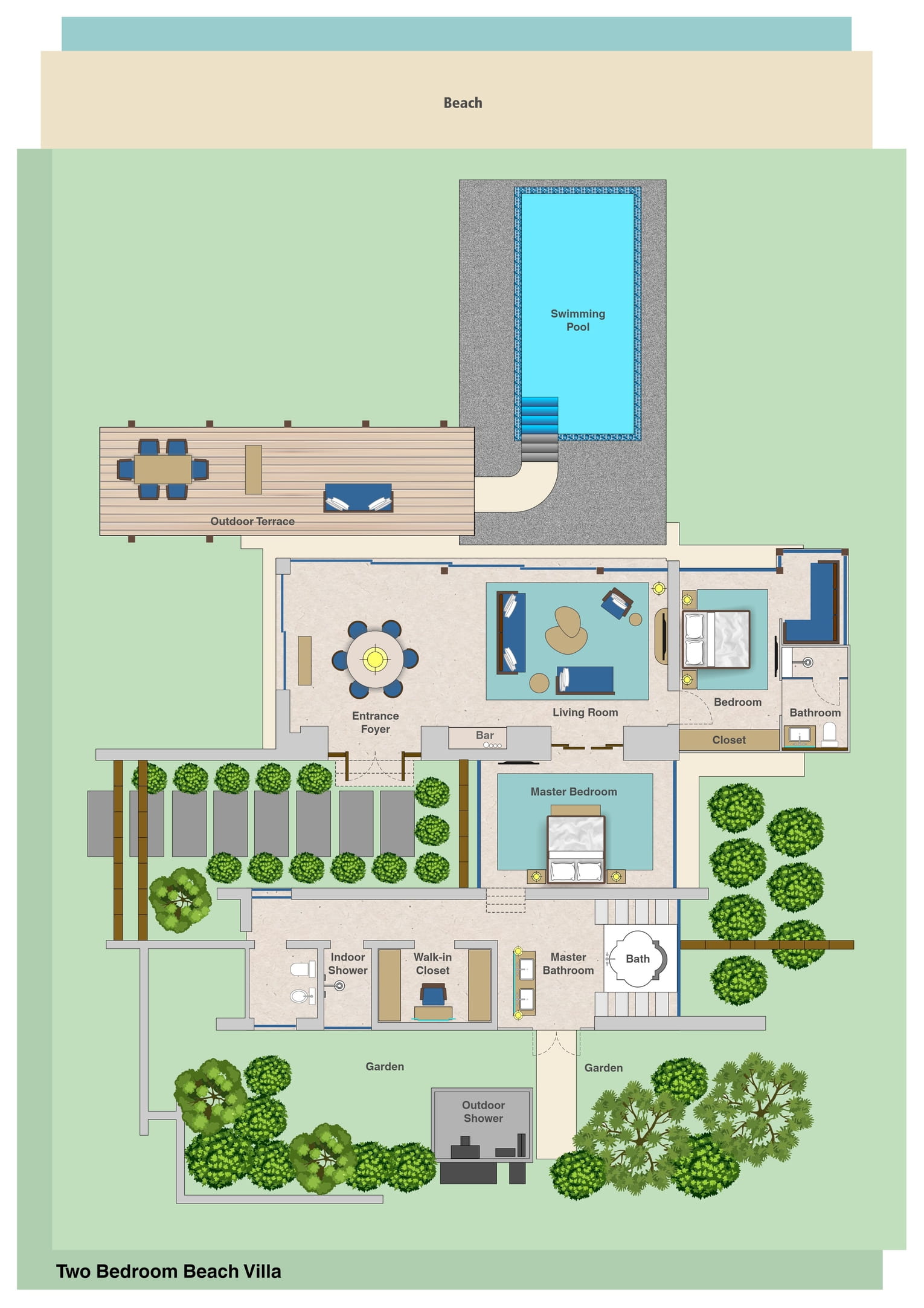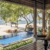 Пляжная вилла c 2-мя спальнями: в главной спальне – двуспальная кровать, собственная ванная комната с ванной, душевой кабиной, гардеробной и тропический душ на открытом воздухе; в гостевой спальне – двуспальная кровать, гостевая ванная комнат с душевой кабиной, гостиная с обеденной зоной на 6 персон, меблированная терраса с обеденной зоной на 6 персон, частный бассейн (12 м²), сад, шезлонги, пляжный гамак, выход на пляж, вид на море; привилегии для гостей*, план номера;