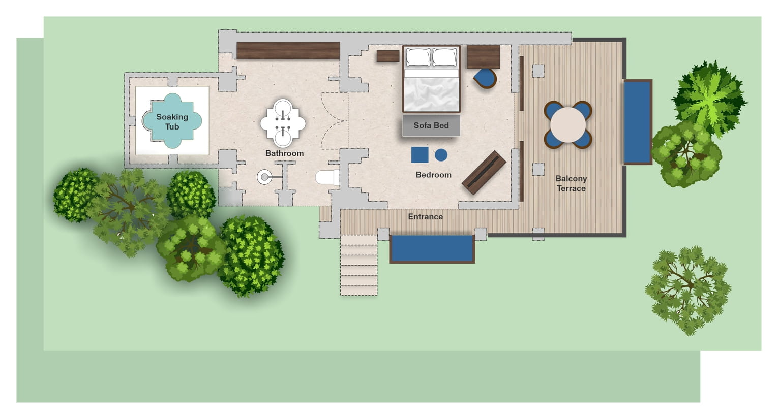 Номер на верхнем этаже: 1 двуспальная кровать, кушетка, гостевой уголок, ванная комната с душем, ванна и душ на открытом воздухе, меблированный балкон с обеденной зоной и кушеткой, вид на ландшафтный сад, план номера;
