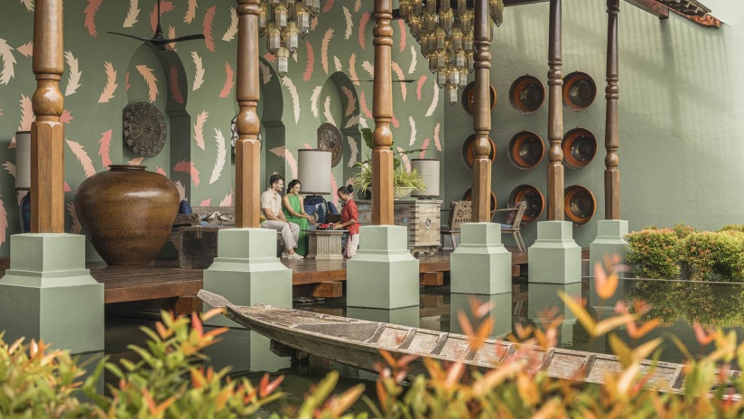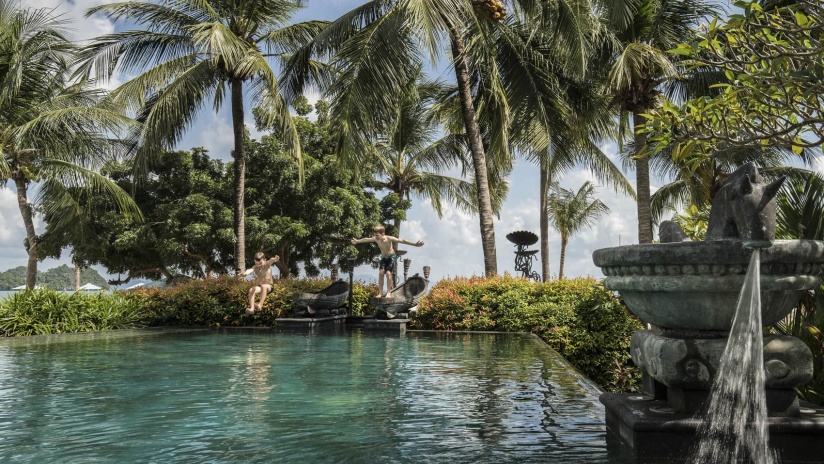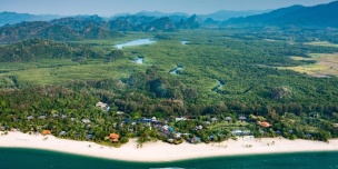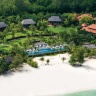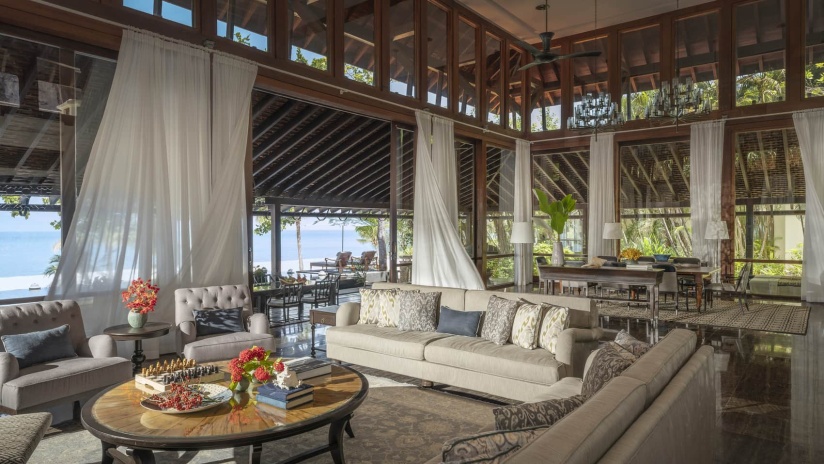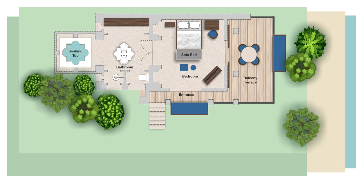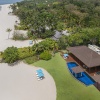 Пляжная семейная вилла с 1 двуспальной и 2-мя односпальными кроватями, ванная комната с ванной, душевой кабиной, гардеробной и тропический душ на открытом воздухе, гостиная зона отделена стеллажной перегородкой, меблированная терраса с обеденной зоной на 4 персоны, шезлонги, частный бассейн (12 м²), сад, искусственные пруды, пляжный гамак, выход на пляж, вид на море; гостям предоставляется трансфер из аэропорта и обратно и 1 бесплатный напиток из мини-бара по прибытии; план номера;