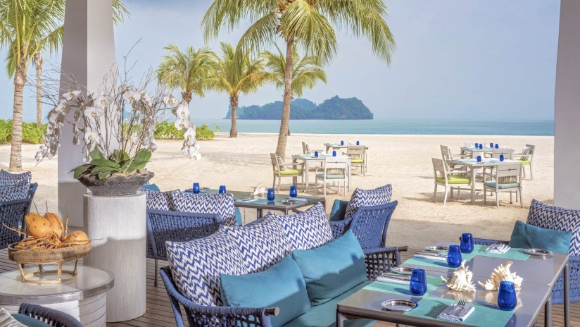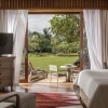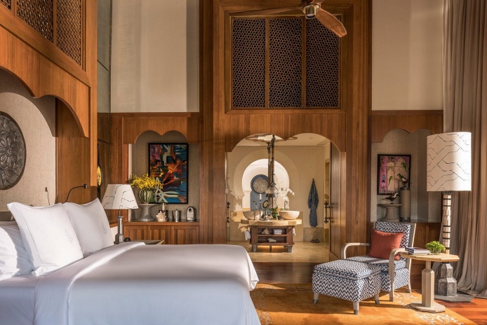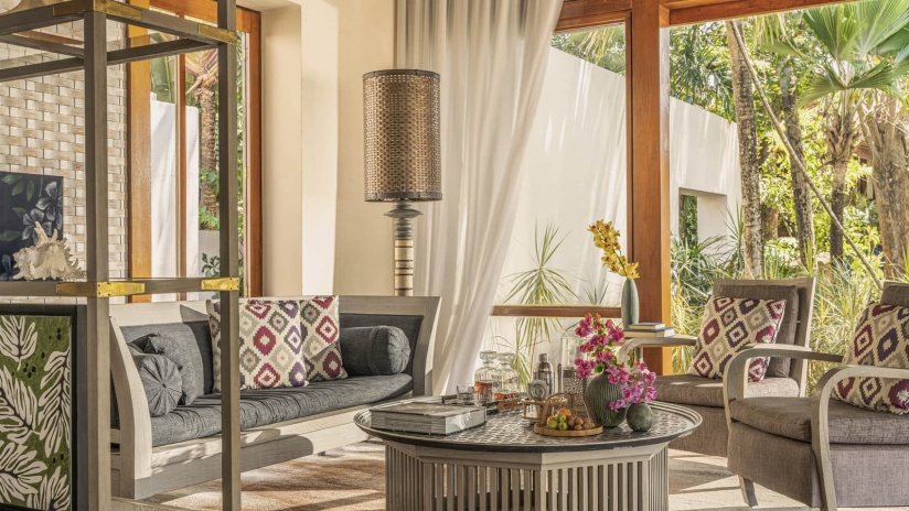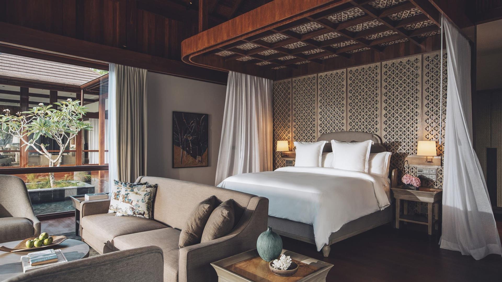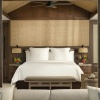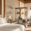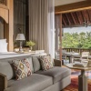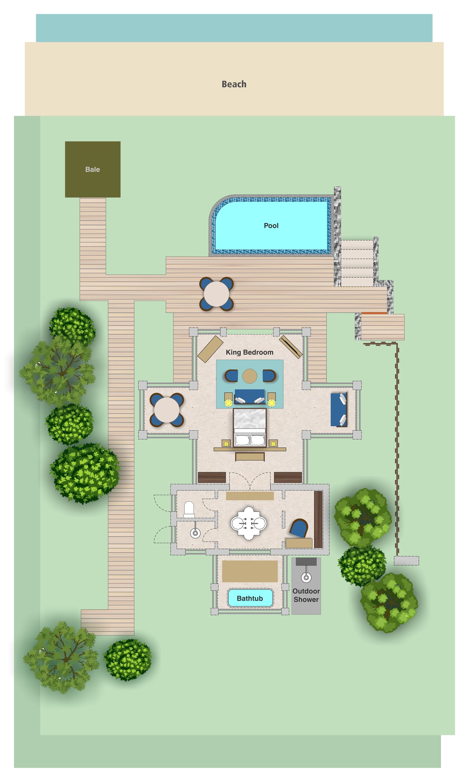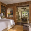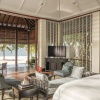 Пляжная вилла: спальня с двуспальной кроватью, ванная комната с ванной, душевой кабиной, гардеробной и тропическим душем на открытом воздухе, гостиная зона отделена стеллажной перегородкой, есть отдельный TV–лаунж, отдельный кабинет, меблированная терраса с обеденной зоной на 4 персоны, шезлонги, пляжный гамак, частный бассейн (14 м²), сад, выход на пляж, вид на пруды, море и пляж; привилегии для гостей*, план номера;