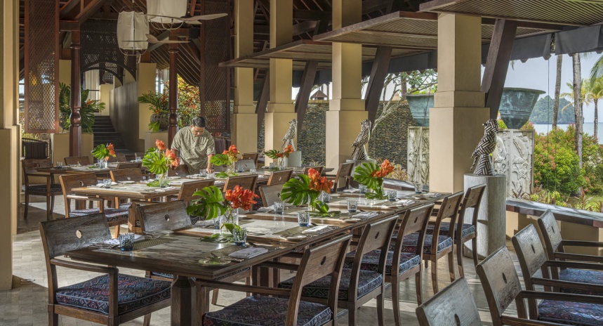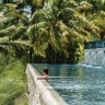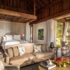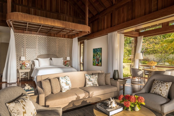 Королевская вилла из двух раздельных павильонов: в одном – спальня с двуспальной кроватью, кушеткой, обеденным столом и просторной ванной комнатой с ванной, душевой кабиной, гардеробной и тропический душ на открытом воздухе, выход из спальни на собственную меблированную террасу с обеденной зоной, шезлонгами и беседкой: в другом павильоне – гостиная с зоной отдыха, обеденным столом на 6 персон, барная стойка, подсобные помещения, гостевой туалет, выход на вторую меблированную террасу с обеденной зоной на 6 персон, кушеткой, шезлонгами, беседкой и бассейном-инфинити, сад, пляжный гамак, выход на пляж; вид на море, на скалы и лес, привилегии для гостей*, план номера;