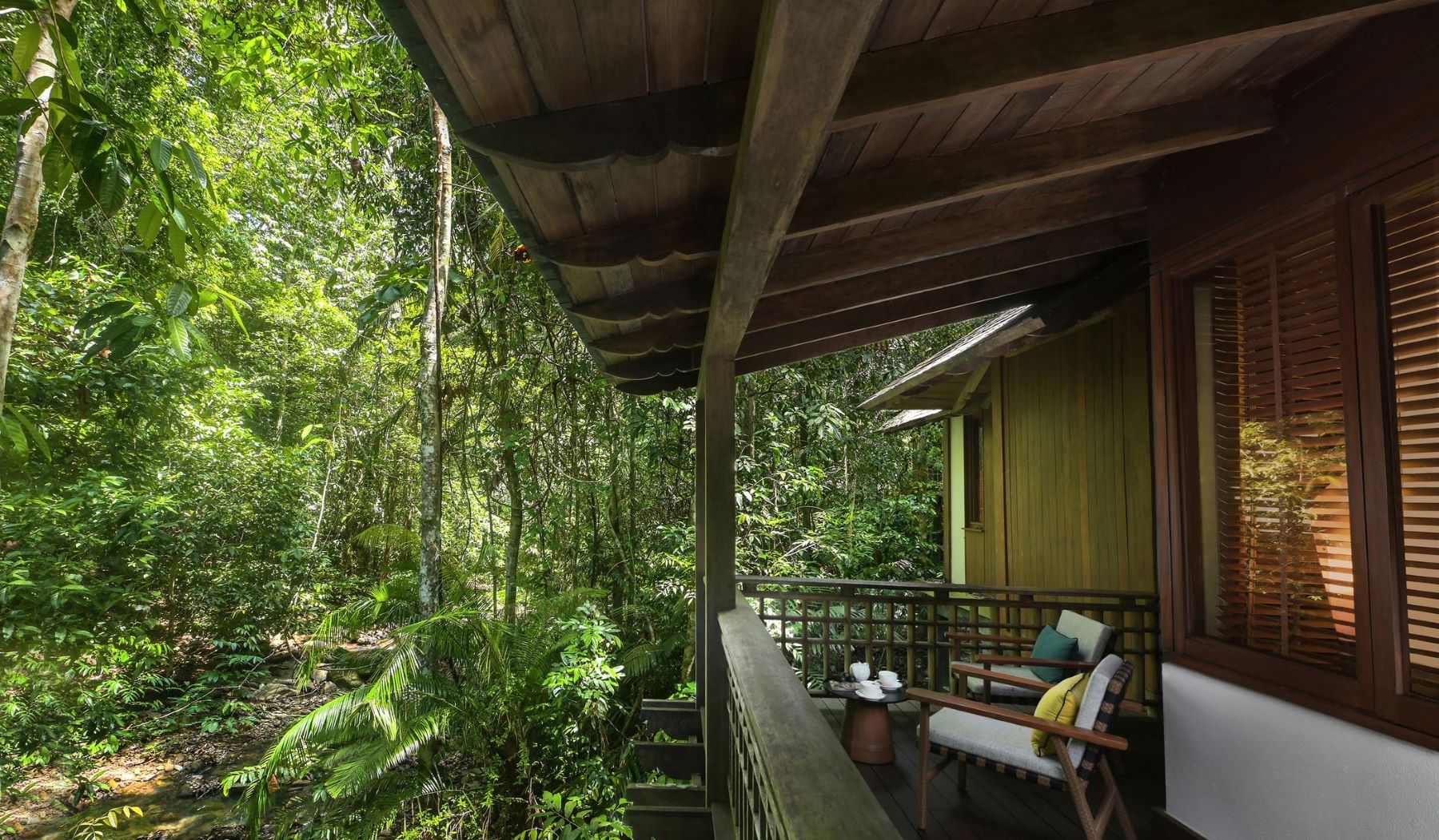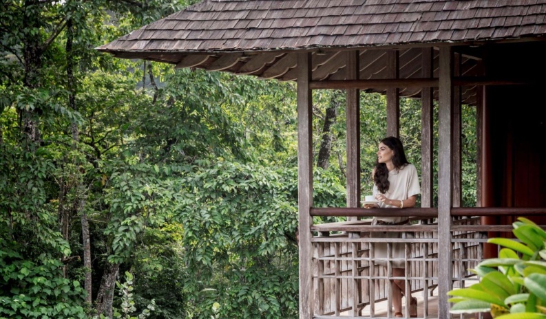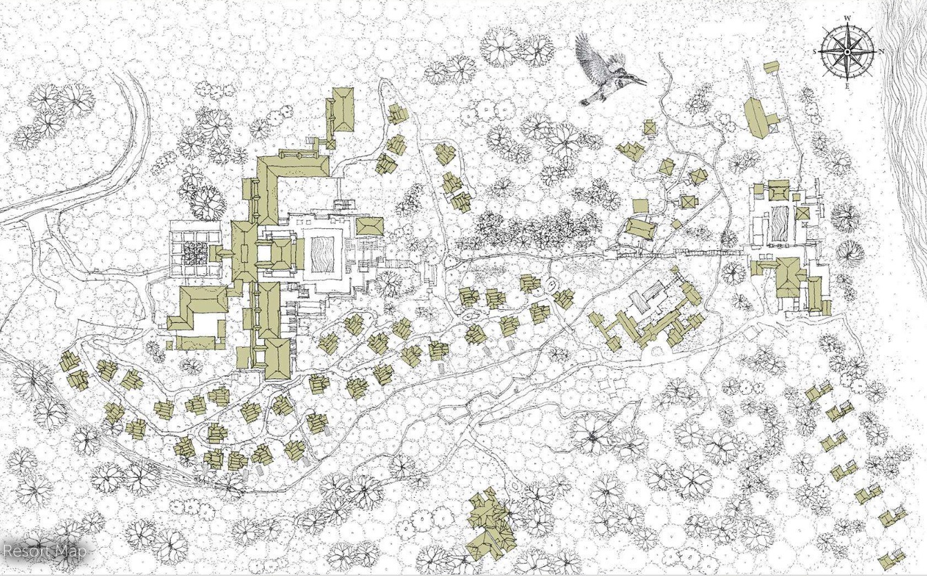 Уединенные виллы** на сваях в тропическом лесу, открытая планировка: двуспальная кровать king-size или 2 односпальные кровати, письменный стол, туалетный столик, гостиная зона с диваном, просторная ванная комната с душевой кабиной, ванной, двойной раковиной и гардеробной зоной, пополняемый мини-бар (за исключением снэков и алкогольных напитков), меблированный балкон, вид на реку и тропический лес, план виллы;