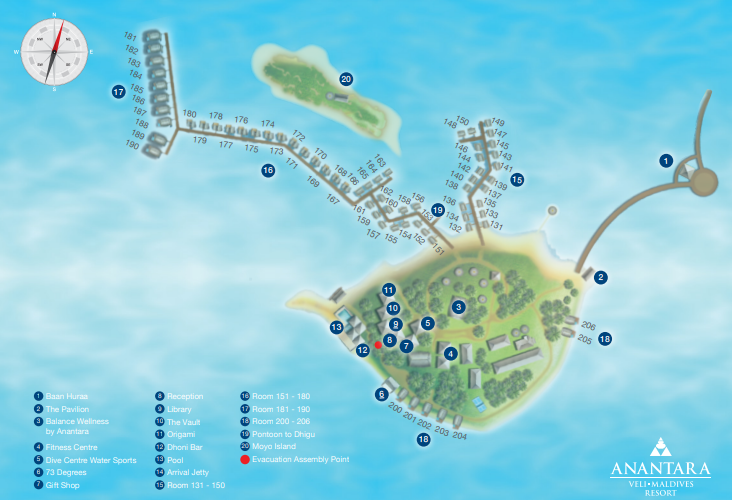Входит в комплекс Anantara c соседними островами-отелями Anantara Veli и Naladhu.