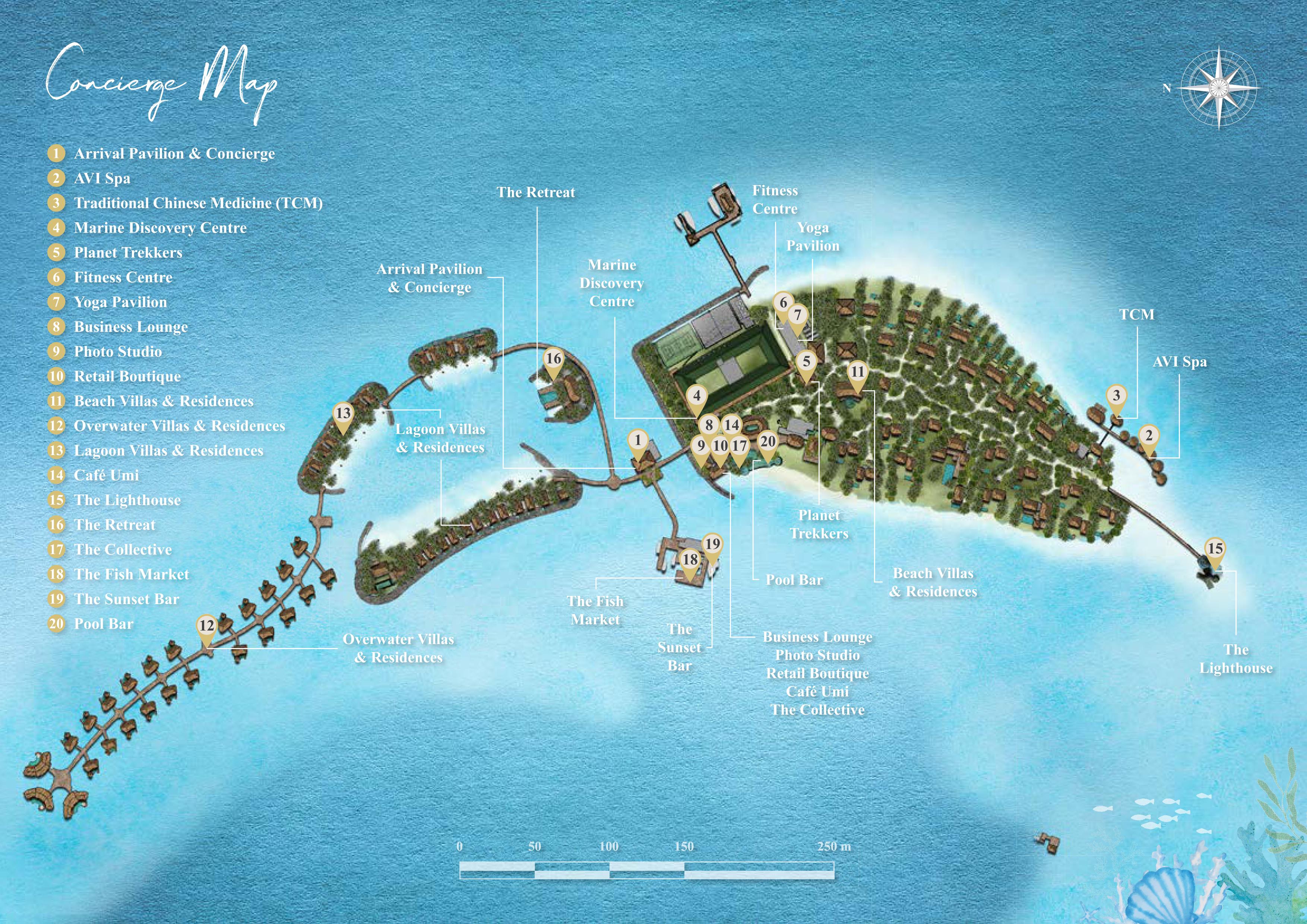 К услугам гостей просторные виллы у пляжа и на воде, открытый бассейн и спа-центр, лагуна с домашним рифом, фитнес-зал. В отеле находится самый большой в мире подводный ресторан 5.8 Undersea.