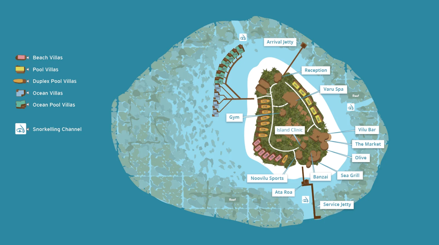 На острове – пляжи с белым песком и коралловый риф, к услугам гостей – открытый бассейн, спа-центр с сауной, фитнес-зал. Из больших окон вилл открывается вид на белый песчаный пляж и океан.
