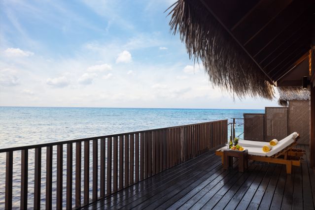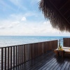Надводные виллы с видом на закат. Спальня с двуспальной кроватью king size, ванная комната с ванной и душем, терраса с прямым спуском в воду.