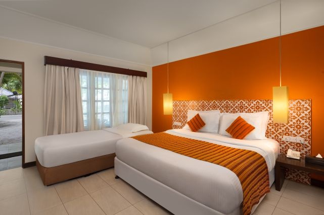 2 спальни (2 смежных номера Beach Villa): двуспальная кровать и 2 односпальные кровати, ванная комната с душем на открытом воздухе, терраса, кресла-мешки для отдыха, вид на закат;