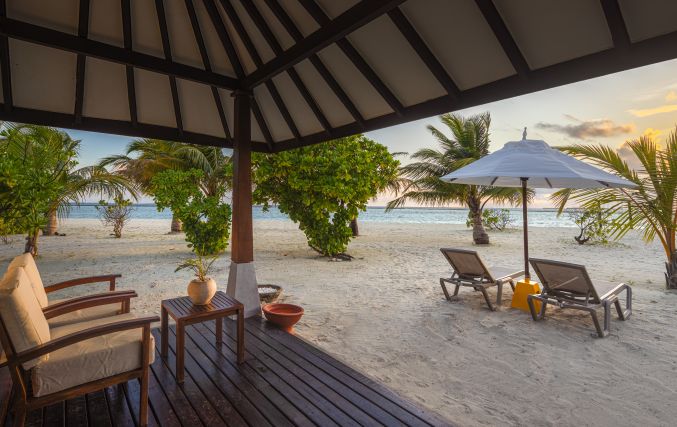 Пляжная вилла, с видом на закат, двуспальная кровать, ванная комната с душем на открытом воздухе, 2 шезлонга для принятия солнечных ванн;