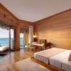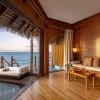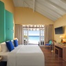 Виллы расположены над водой, двуспальная кровать, зона гостиной, ванная комната с 2 умывальниками, терраса с джакузи и с лестницей, ведущей в океан.