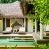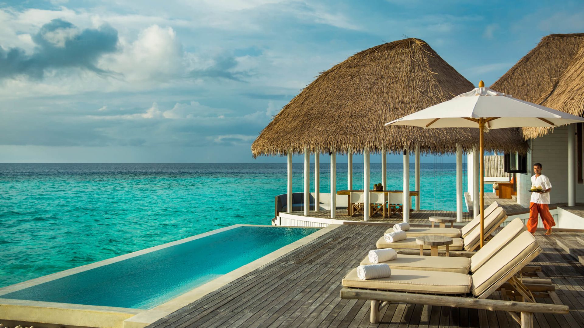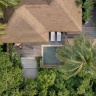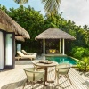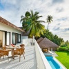 Номера расположены на сваях над водой в восточной части острова, двуспальная кровать king-size, гостиная зона с диваном, ванная комната с ванной и душем, душ под открытым небом, терраса с лежаками, обеденной зоной, беседкой и бассейном, прямой доступ к лагуне, вид на океан, план номера;