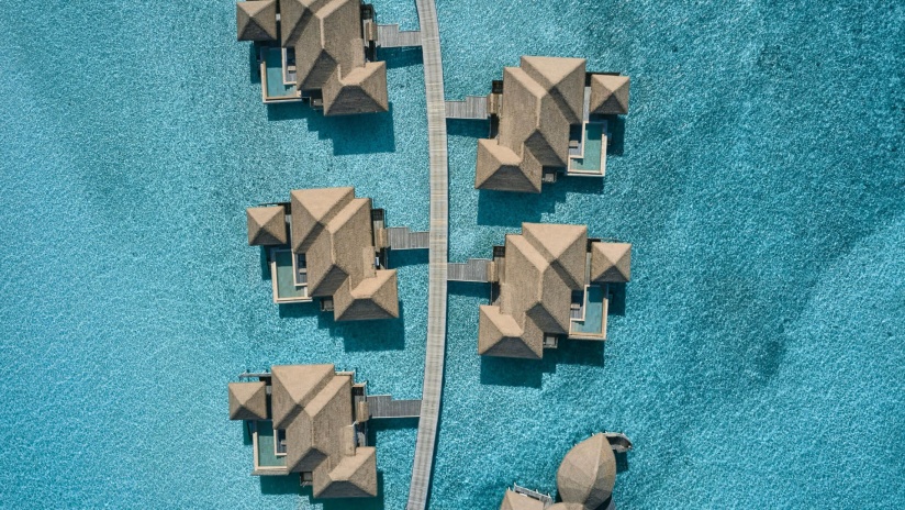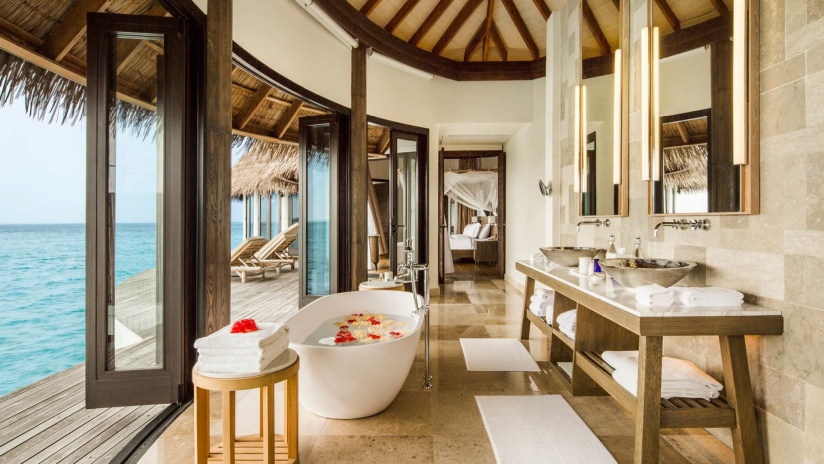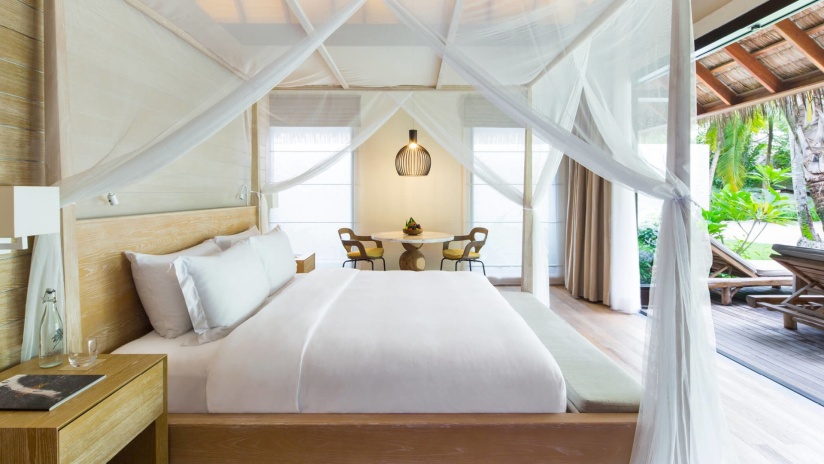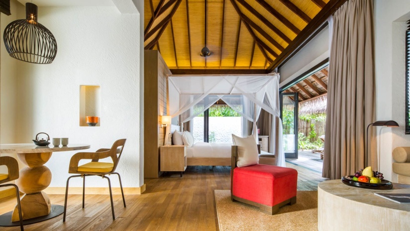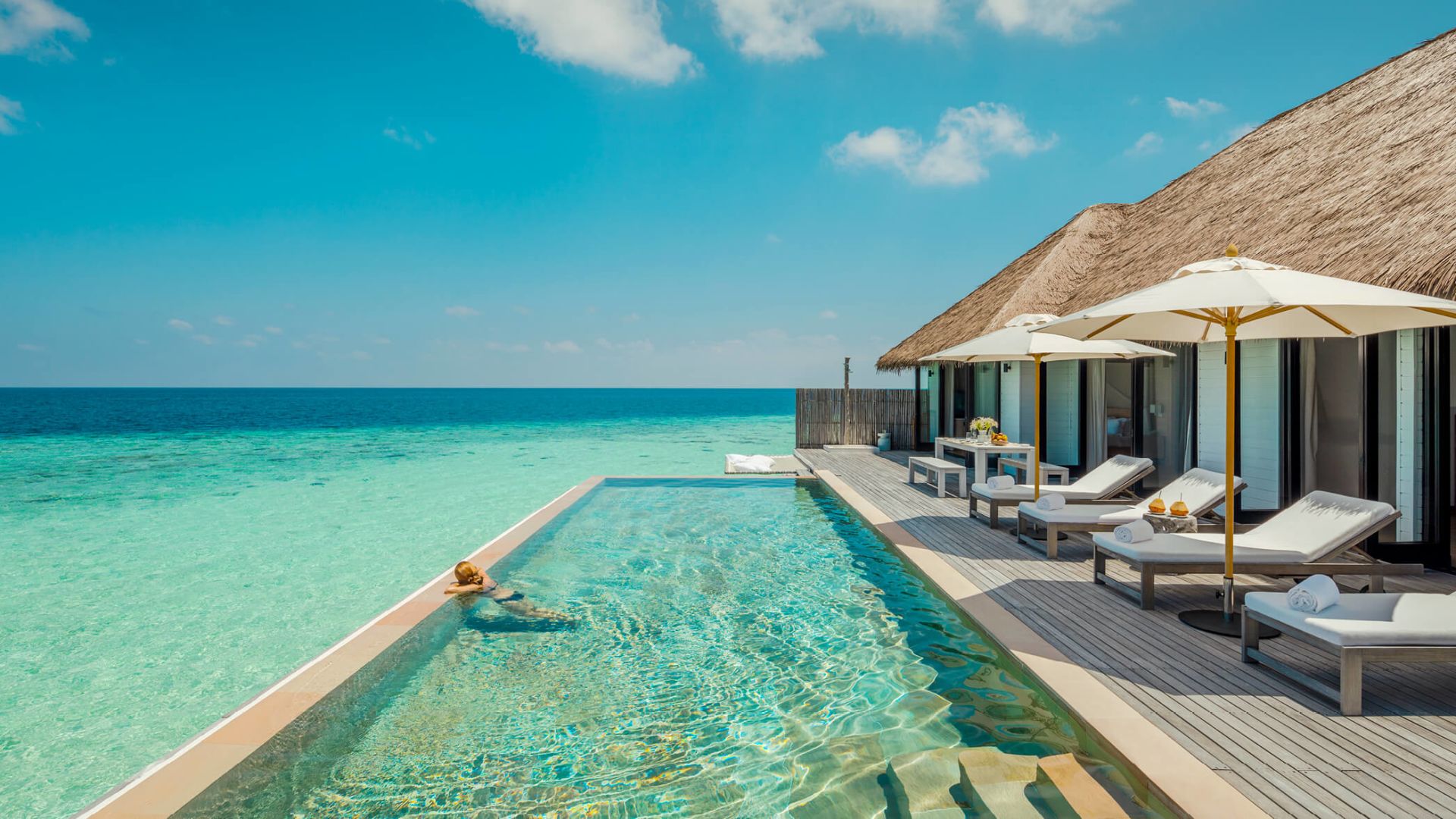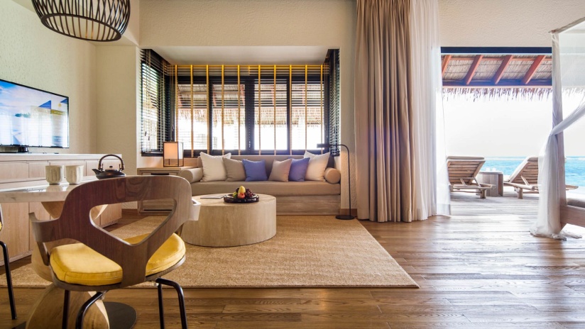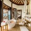 Номера расположены на сваях над водой в западной части острова, спальня с двуспальной кроватью king-size, гардеробная, отдельная гостиная комната с диваном, ванная комната с ванной и душ, душ под открытым небом, терраса с лежаками, обеденным столом, беседкой и бассейном, вид на океан, прямой доступ к лагуне, план номера;