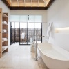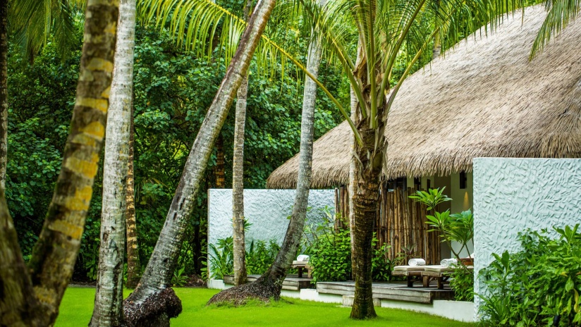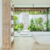 Номера расположены в тропическом саду, спальня с двуспальной кроватью king-size, ванная комната с ванной и душем, душ под открытым небом, терраса с зоной отдыха и обеденной зоной, вид на сад, план номера;