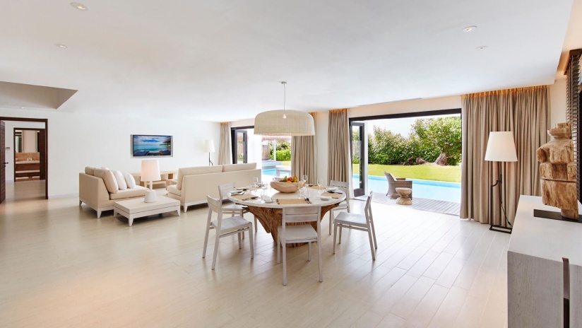 Номера расположены в тропическом саду с прямым выходом на пляж, 2 спальни: двуспальная кровать king-size и 2 односпальные кровати, 2 ванные комнаты (одна с ванной и душем, вторая с душем), отдельная гостиная комната, терраса с лежаками, обеденным столом, беседкой и бассейном, вид на сад, план номера;