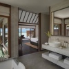На сваях над водой, двуспальная кровать king-size, гостиная зона с диваном и обеденным столом, гардеробная и зона для макияжа, ванная комната с ванной и душем, терраса, персональный бассейн, прямой спуск в воду, вид на океан и закат; описание и план номера;