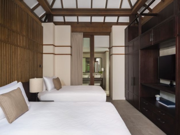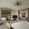 2 спальни: двуспальная кровать king-size и 2 односпальные кровати, гостиная зона, 2 ванные комнаты, душ под открытым небом, терраса, персональный небольшой бассейн, выход к пляжу; описание и план номера;