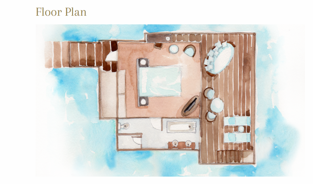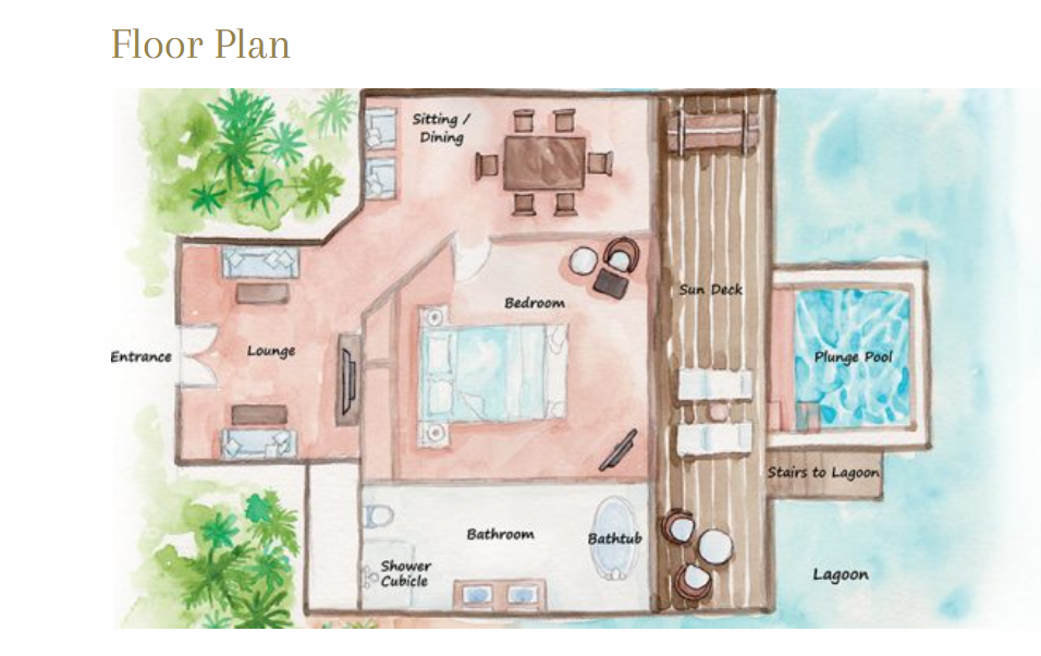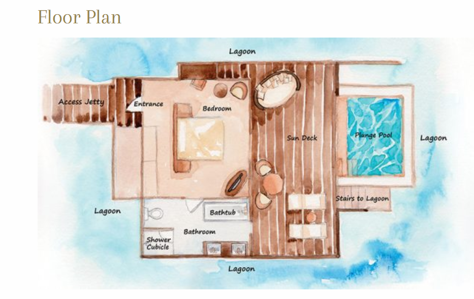 Вилла частично расположена над водой, спальня с двуспальной кроватью king-size, отдельная гостиная комната с диваном, обеденным столом и мини-кухней, ванная комната с ванной и душем, тренажёр – беговая дорожка, меблированная терраса, небольшой персональный бассейн, спуск в лагуну, вид на океан, план номера;