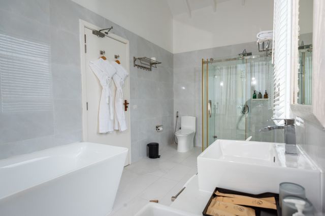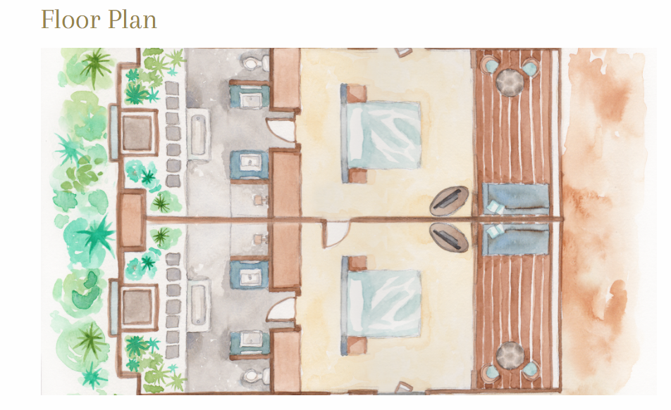 2 спальни с двуспальными кроватями king-size, кушетка, 2 частично открытые ванные комнаты с ванной и душем, 2 террасы, вид на океан, выход на пляж, пляж с пологим заходом в океан, песок без коралловой крошки, вилла выходит на сторону рассвета, план номера;