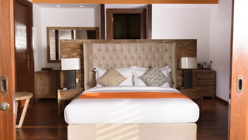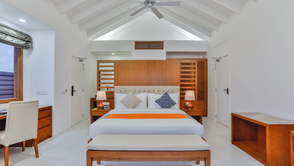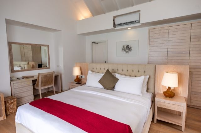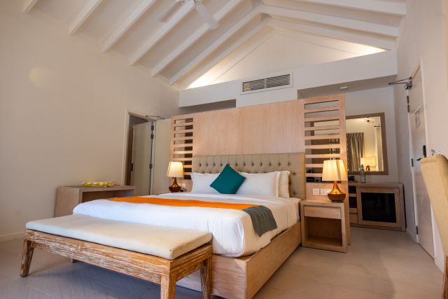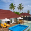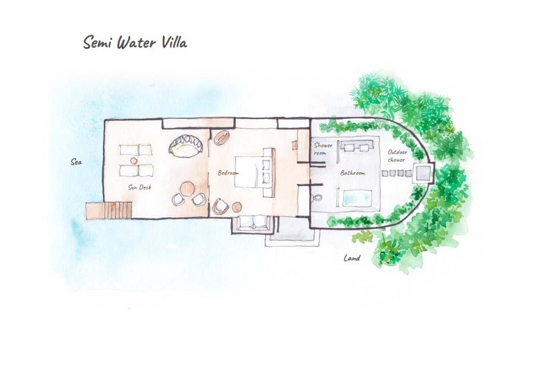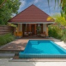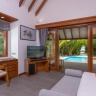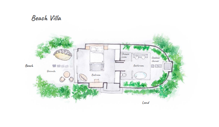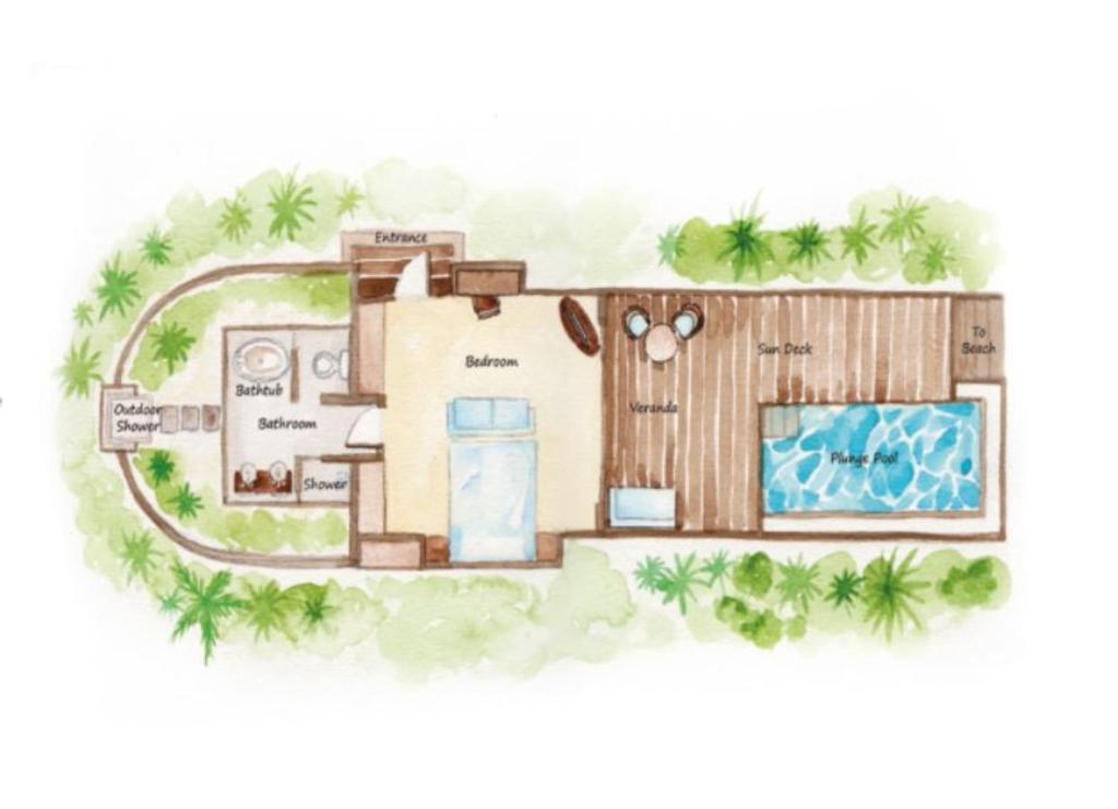 Пляжная вилла,  двуспальная кровать king-size, кушетка, ванная комната с ванной и душем, душ под открытым небом, меблированная терраса, небольшой персональный бассейн, все виллы выходят на сторону заката, пологий заход в океан и комфортное плавание, песок без коралловой крошк, см.план номера. При размещении 2 взрослых + 2 ребенка может быть предоставлено две дополнительных кровати;
