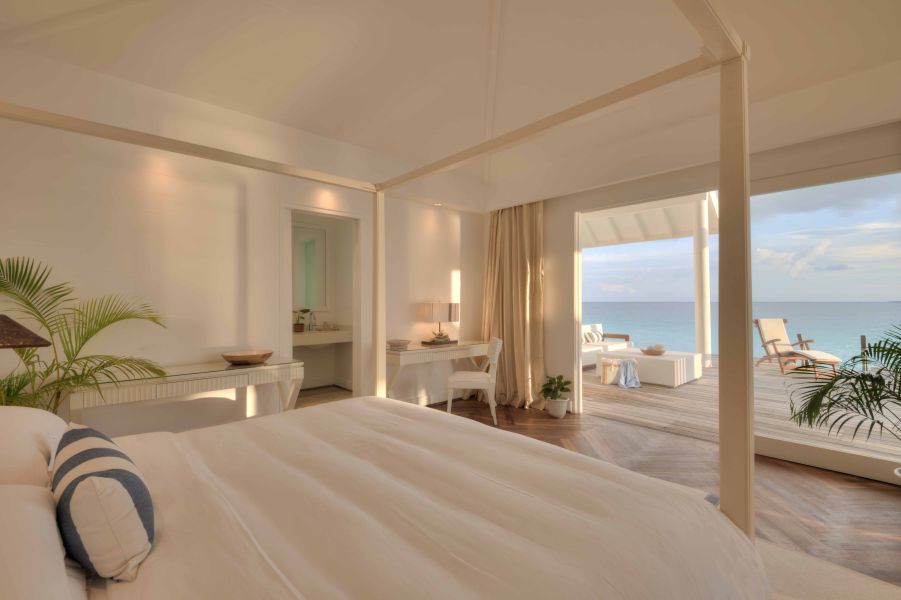 Надводная вилла с собственным спуском в воду, двуспальная кровать king-size, гостиная зона с диваном-софа, ванная комната с душем, терраса;