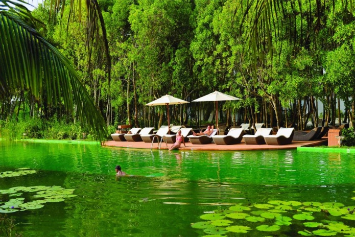• В озере, расположенном на острове, с множеством водяных лилий и водных растений есть зона для купания.