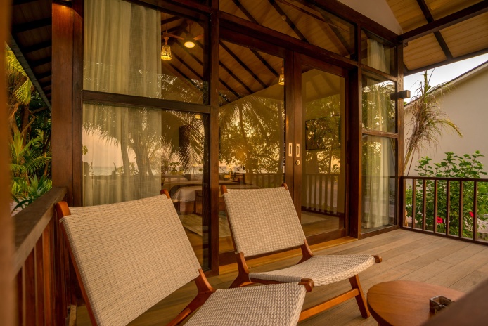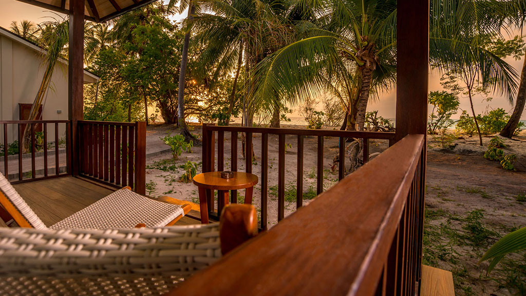 Отдельно стоящие бунгало, береговые номера с прямым выходом на пляж, двуспальная кровать king-size (по запросу 1 дополнительная кровать), ванная комната с душем, терраса, патио, вид на пляж, океан и восход;