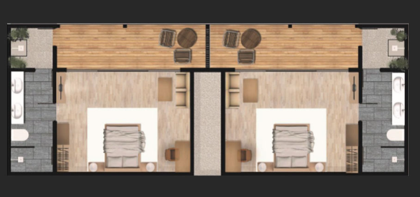 Береговой номер с прямым выходом на пляж, 2 смежных номера, 2 спальни с 2 двуспальными кроватями king-size или 4 односпальными кроватями (по запросу 2 дополнительные кровати), 2 дивана-софа, 2 ванные комнаты с душем, 2 душа под открытым небом, 2 террасы, вид на пляж, океан и восход, план номера.