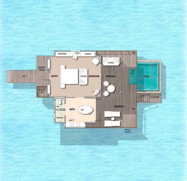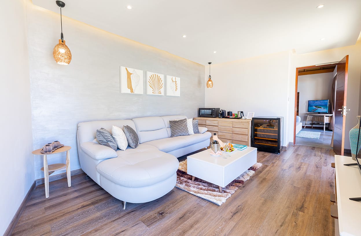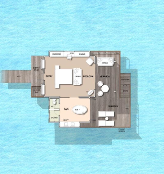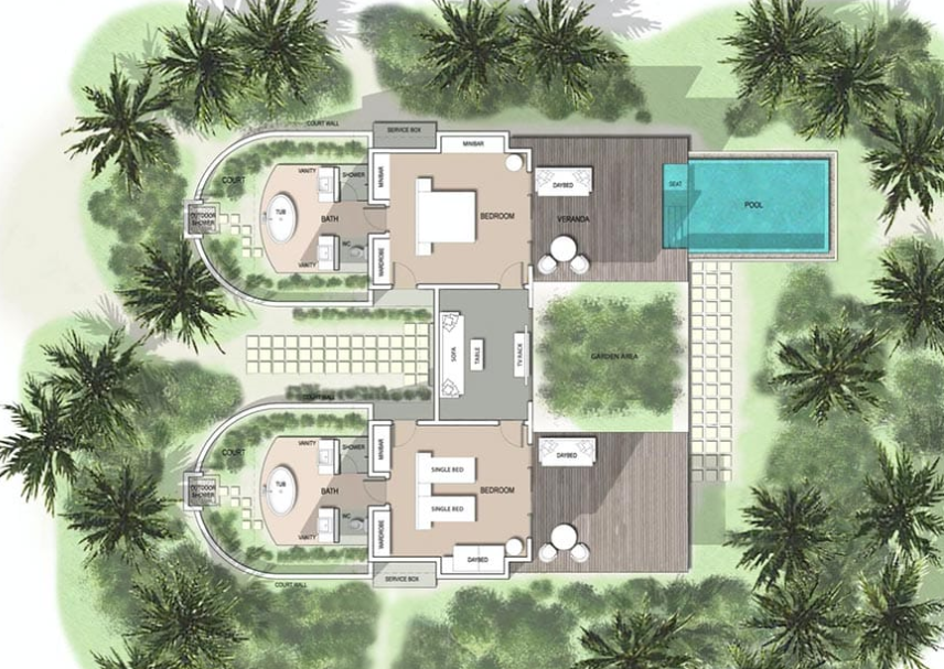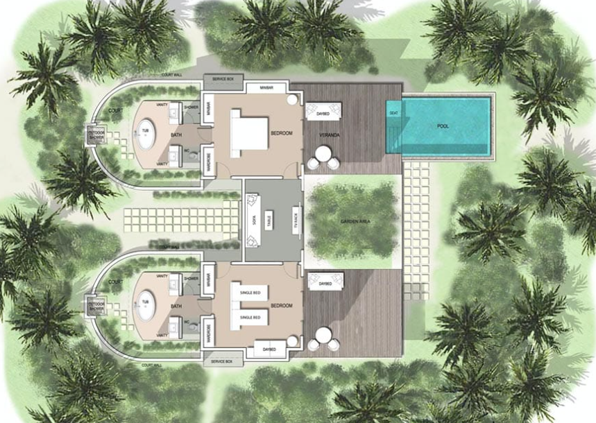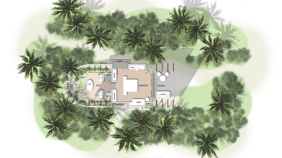 В номерах: кондиционер, шкаф, утюг и гладильная доска, потолочный вентилятор, сейф, халат, банные принадлежности, телефон, мини-бар, фен, телевизор, услуги батлера (есть русскоговорящий), Wi-Fi.