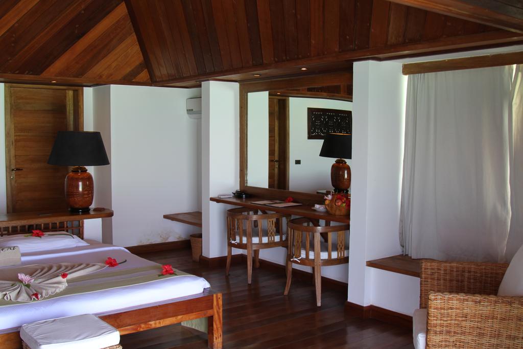 • Over Water Deluxe Villa (надводные виллы улучшенной планировки с видом на восход или закат. В спальне есть небольшая зона отдыха с письменным столом и двумя креслами, просторная полуоткрытая ванная комната с двумя раковинами и душем. Терраса с шезлонгами. Прямой спуск в воду. ТВ с доступом к фильмотеке отеля, кофемашина Nespresso (платно), док-стация iPod, 2 односпальные кровати и двуспальная кровать, 102 м2)