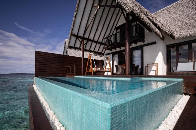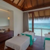 Двухэтажные номера расположены на сваях над водой, спальня с двуспальная кроватью king-size, отдельная гостиная комната с диваном, мини-кухня, 2 ванные комнаты (одна – с ванной и душевой кабиной, вторая – с душем), меблированная терраса с лежаками и качелями, прямой спуск в воду, частный бассейн (17 м²), балкон с креслами, услуги батлера, вид на океан, план номера нижний этаж, план номера верхний этаж;
