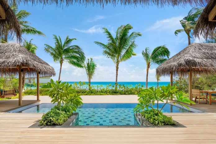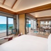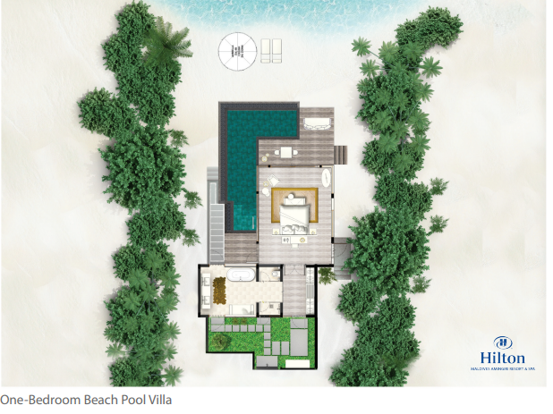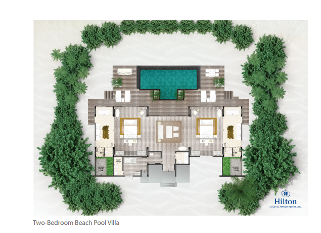 Пляжные виллы, 2 спальни с кроватями king-size (или king-size и 2 раздельные кровати), отдельная гостиная комната, кладовая, комната для прислуги, 2 ванные комната с ванной и душем, душ под открытым небом, терраса с обеденной зоной и шезлонгами, частный бассейн, прямой доступ к пляжу, вид на лагуну, план номера, виртуальный тур;