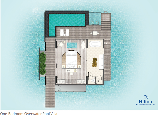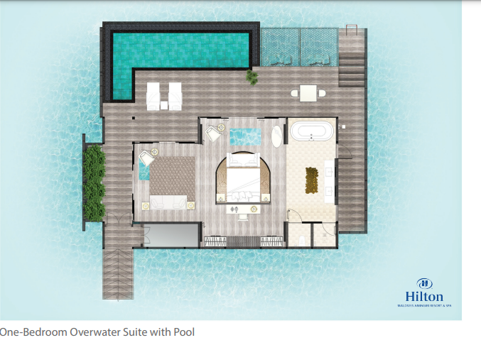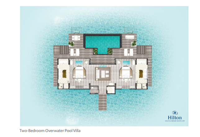 Водная вилла, 2 спальни с кроватями king-size, отдельная гостиная комната, кладовая, 2 ванные комнаты с ванной и душем, душ под открытым небом,  терраса с обеденной зоной и шезлонгами, частный бассейн, лестница, ведущая в океан, гамак у бассейна, вид на лагуну, план номера, виртуальный тур;