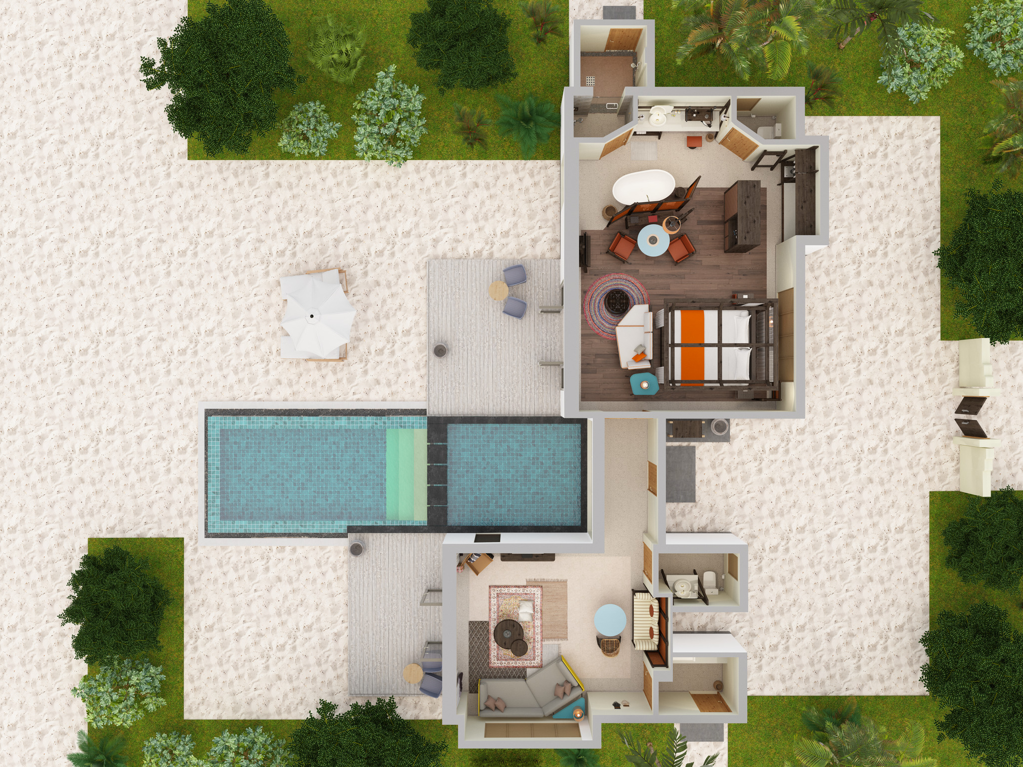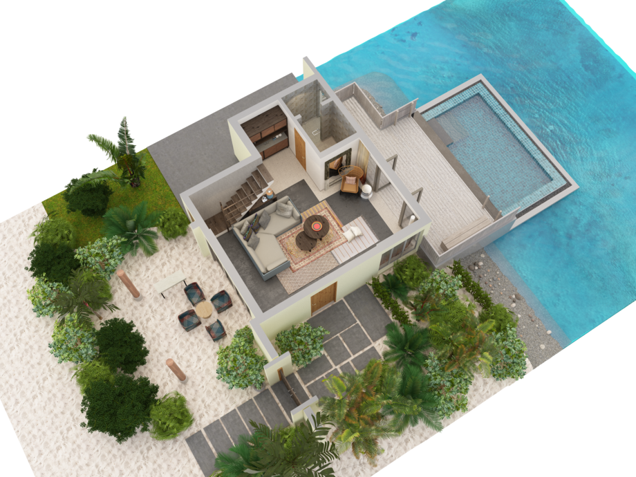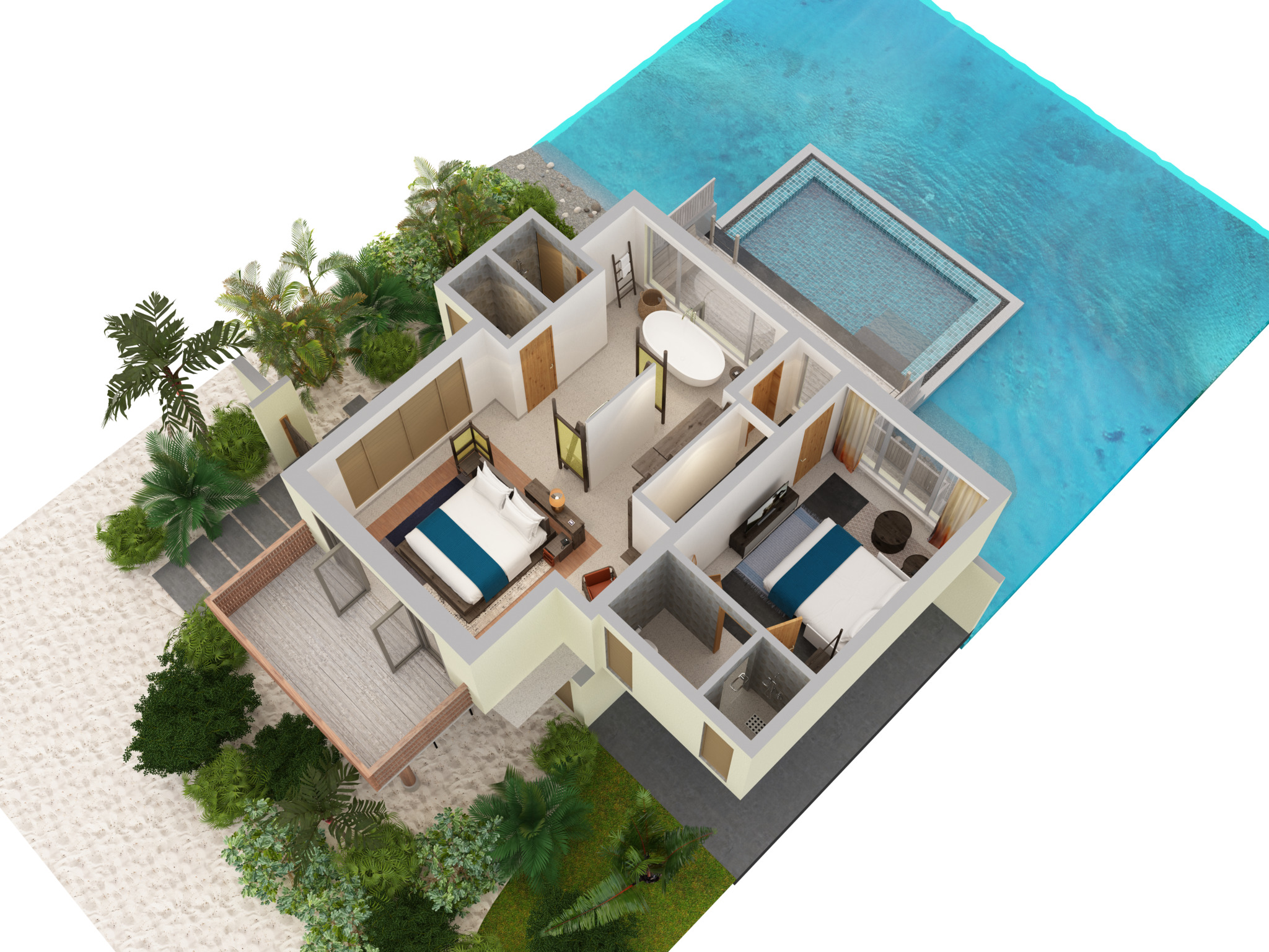 Расположены частично на берегу, частично на сваях над водой, двухэтажный номер, 2 спальни: двуспальная кровать king-size и диван-софа, 2 ванные комнаты (одна с ванной и душем, вторая с душем), гостиная комната с диваном, гостевой туалет, душ под открытым небом, терраса, персональный бассейн, план первого этажа, план второго этажасм.виртуальный тур;