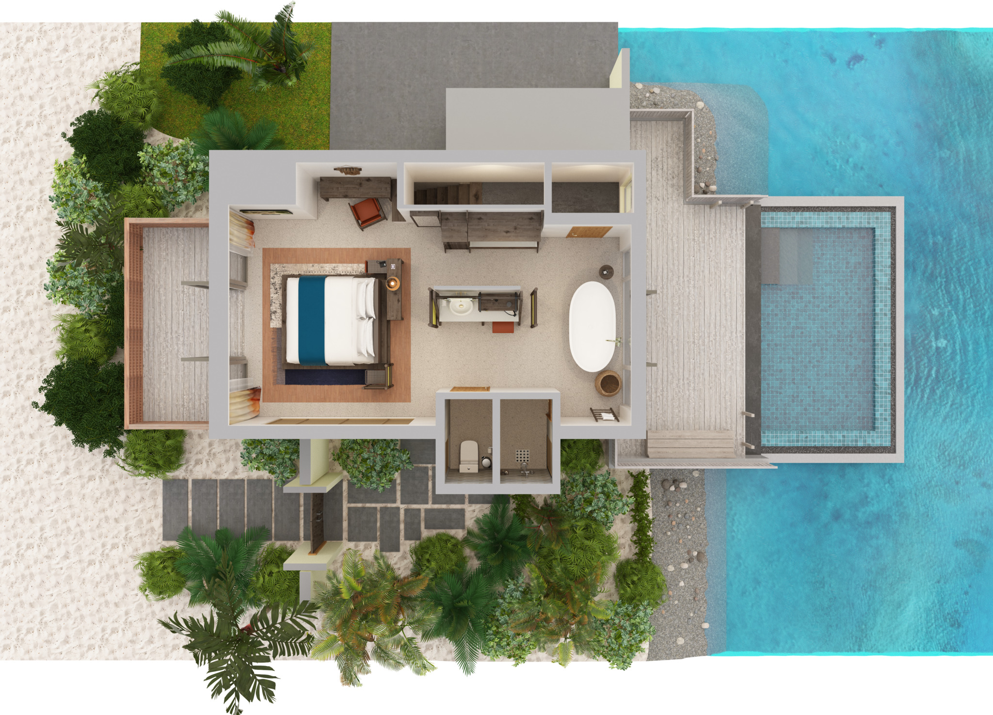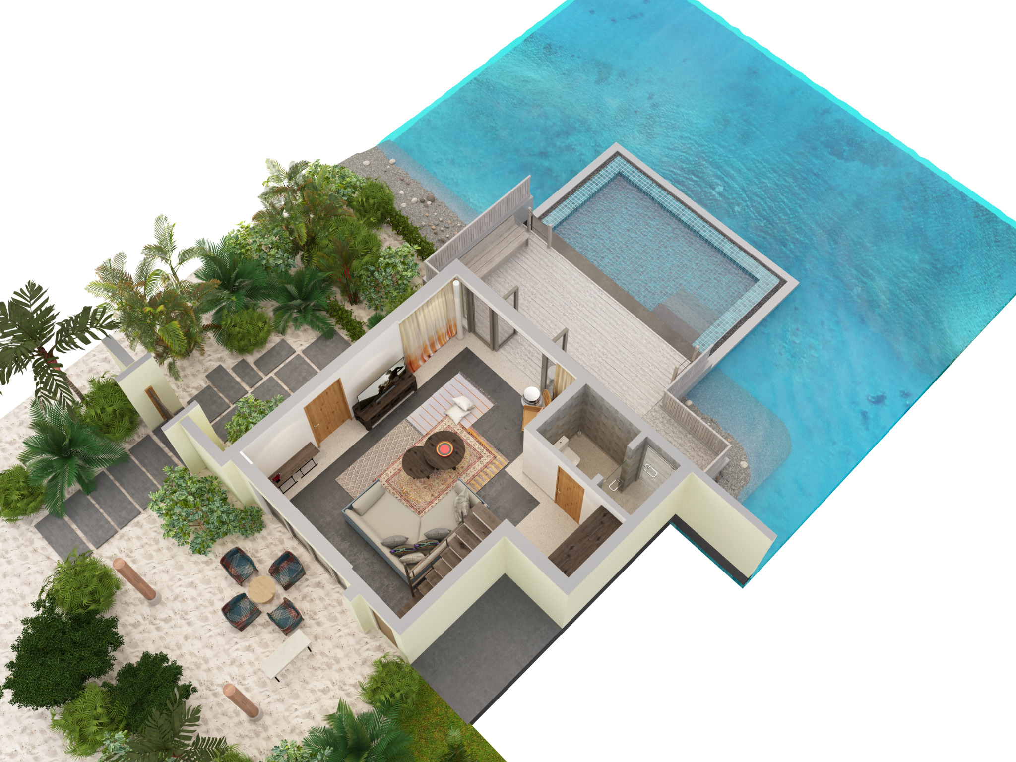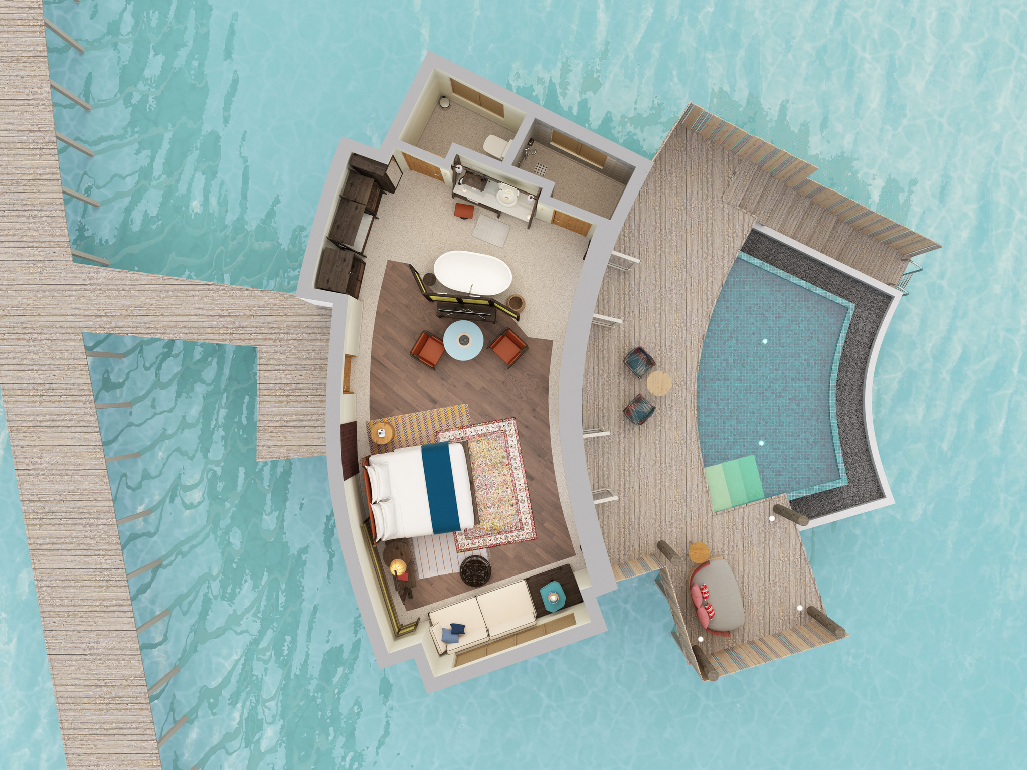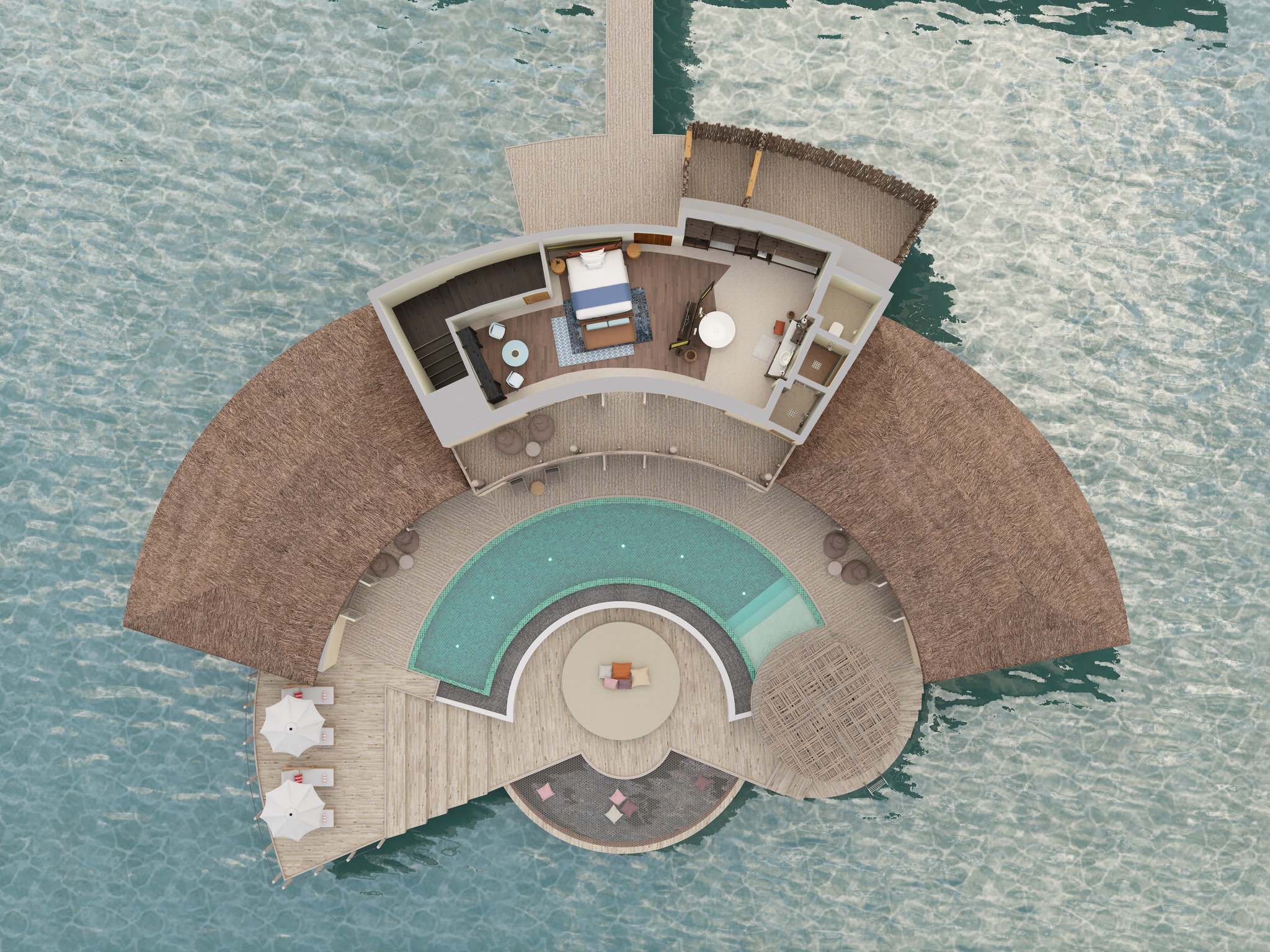 • 14 номеров Overwater Pool Villa (100 м², макс. 2+1).