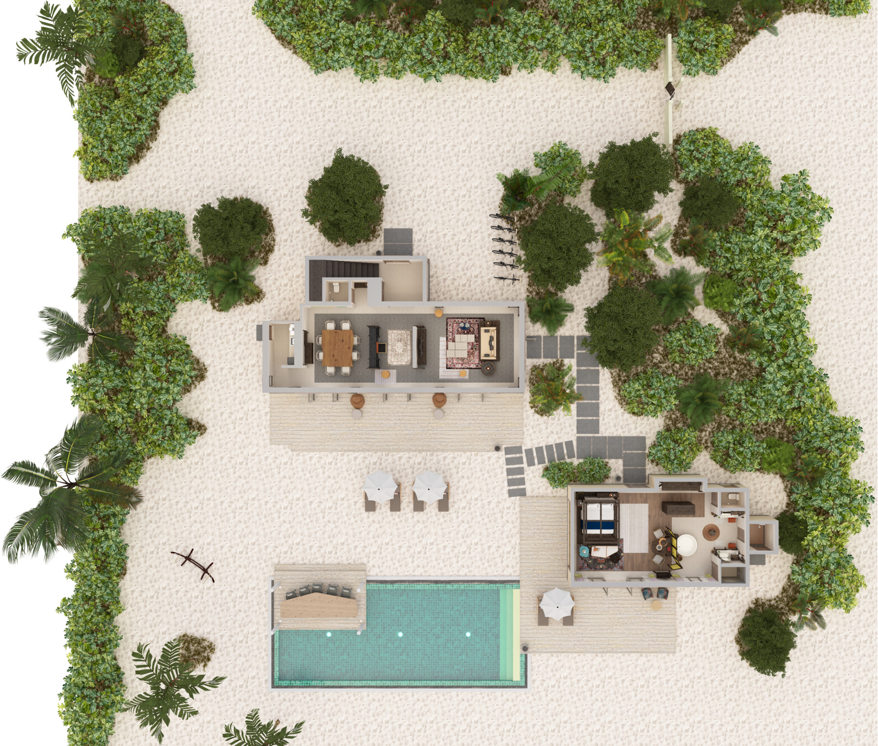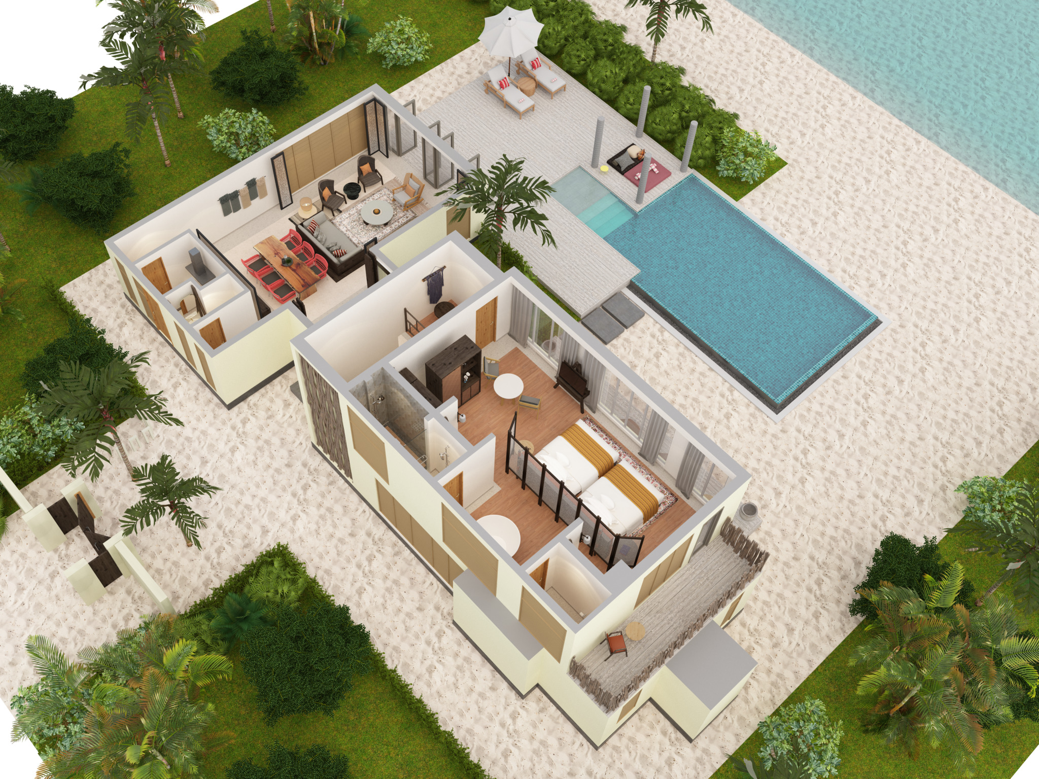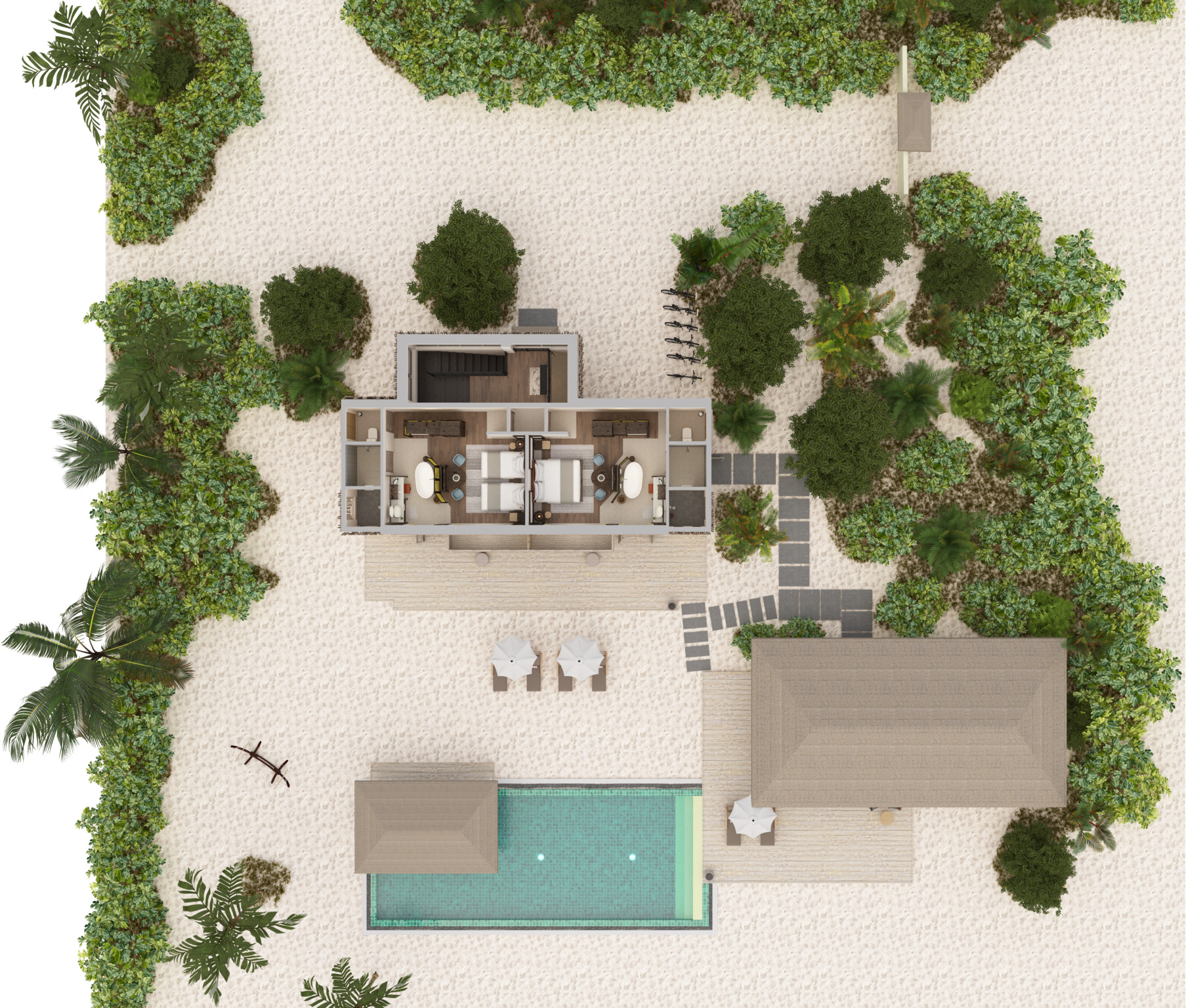 Пляжные виллы, 2 спальни: двуспальная кровать king-size и диван-софа, 2 ванные комнаты (одна с ванной и душем, вторая с душем), гостиная комната с диваном, гостевой туалет, душ под открытым небом, терраса, персональный бассейн, прямой выход на пляж, см.план номера;