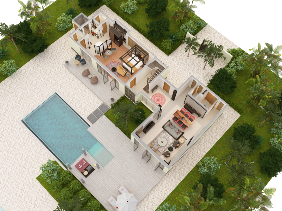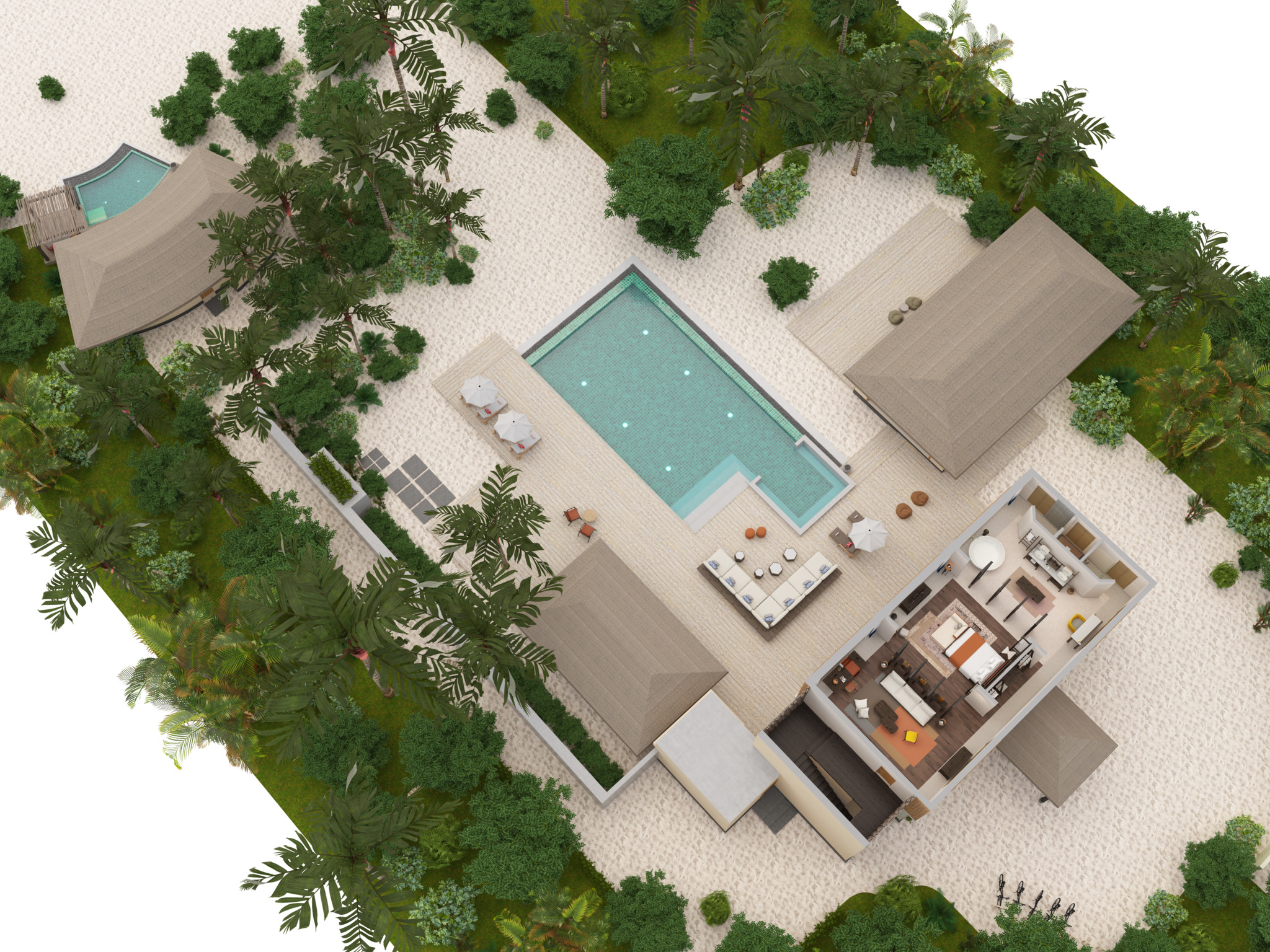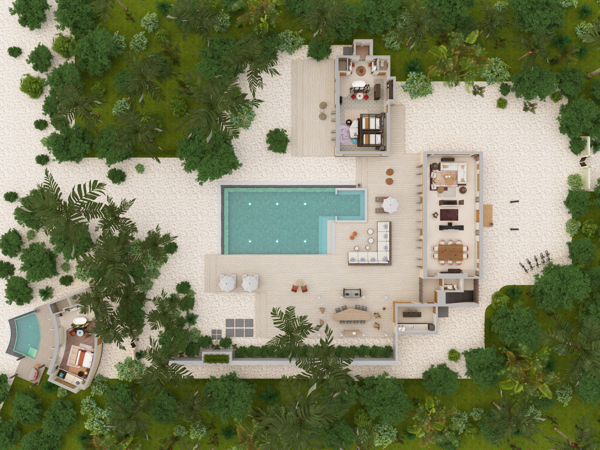 Двухэтажная пляжная резиденция, 3 спальни каждая в отдельно стоящей вилле: 2 двуспальные кровати и 2 раздельные кровати, 3 ванные комнаты с ванной и душем, спальные комнаты открытой планировки – нет двери между спальней и ванной, гостиная комната с диваном, обеденным столом, полностью оборудованная кухня, гостевой туалет, душ под открытым небом, прямой выход к пляжу, терраса с лежаками, зоной отдыха и обеденной зоной, 2 персональных бассейна, зона барбекю на открытом воздухе, вид на океан, см.план первого этажа, см. план второго этажасм.виртуальный тур.